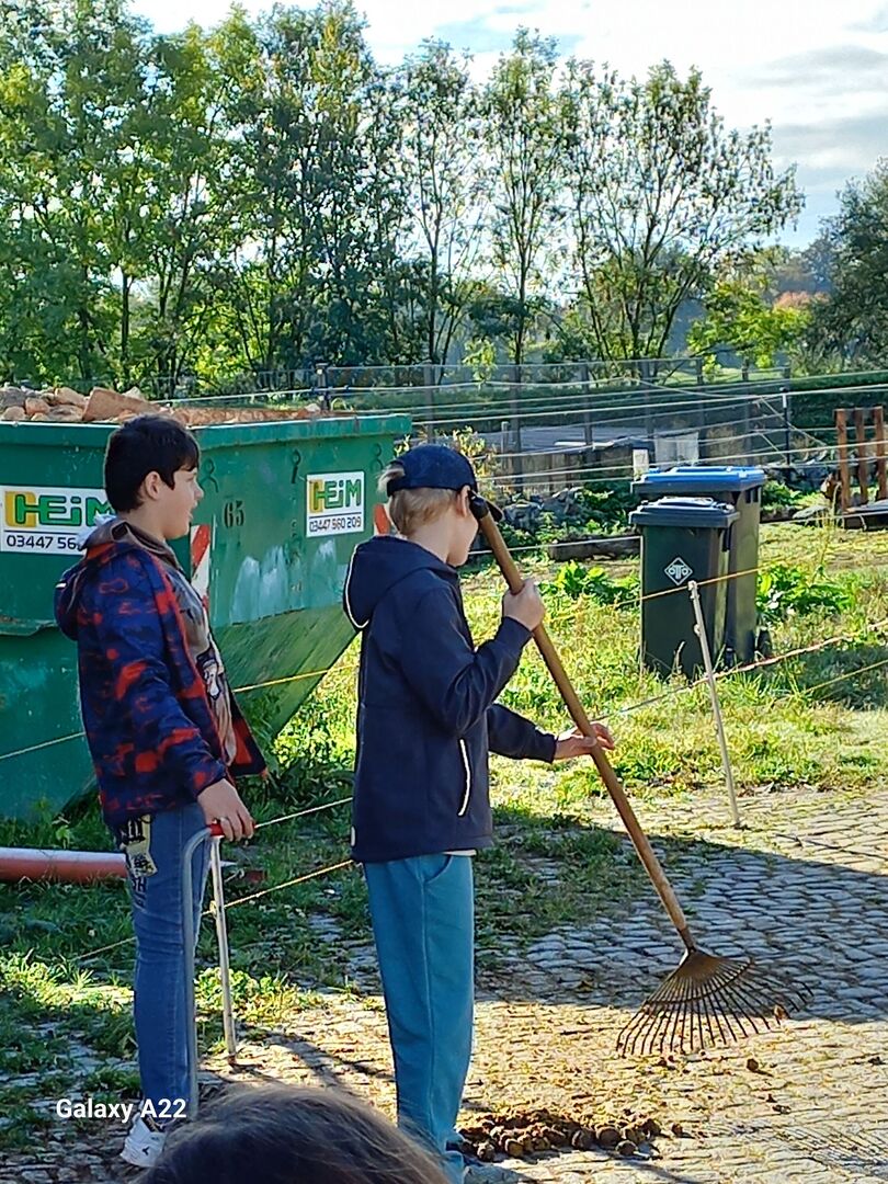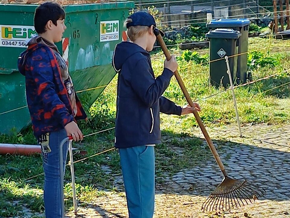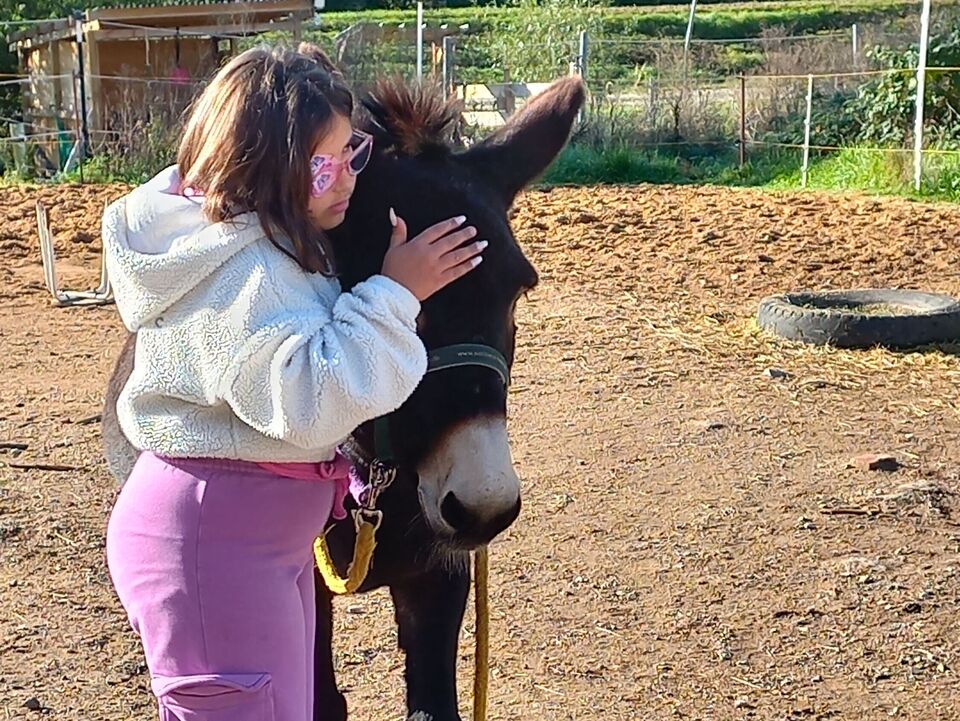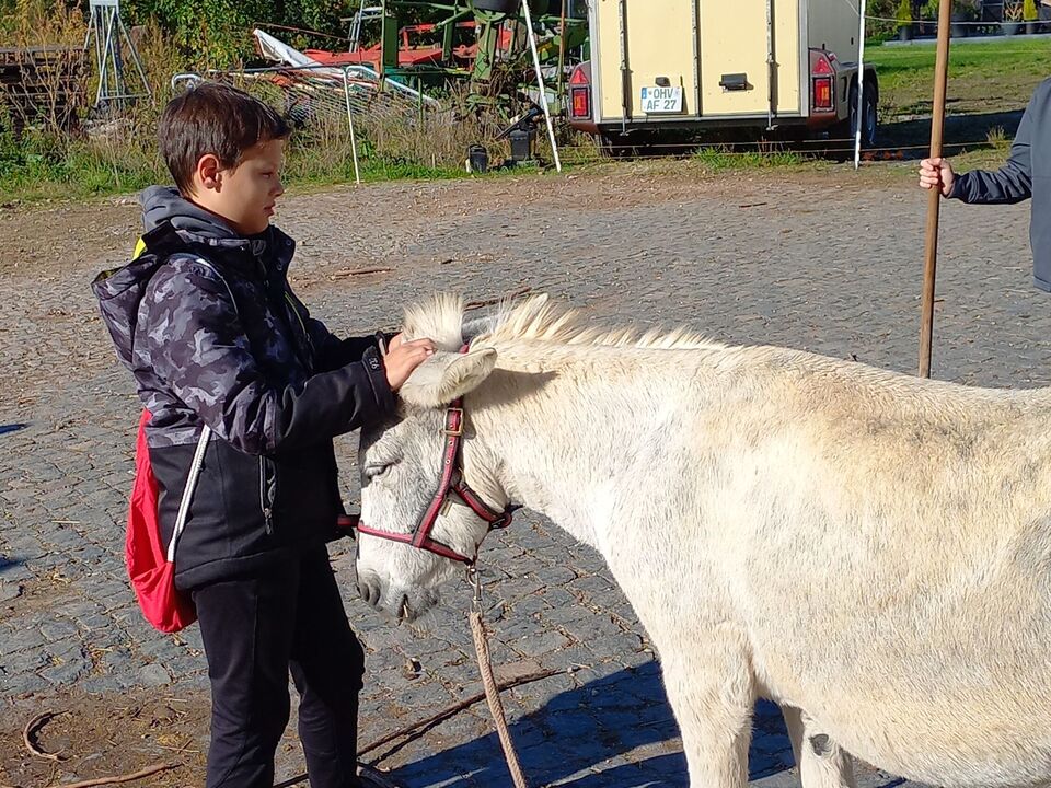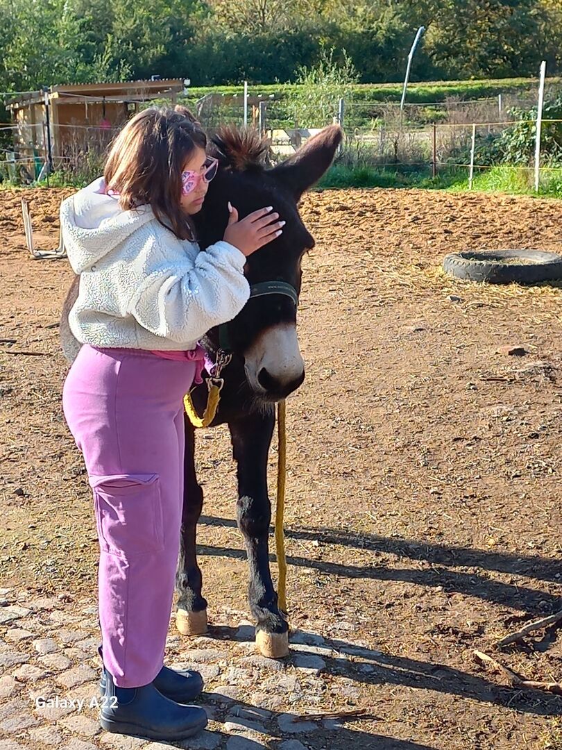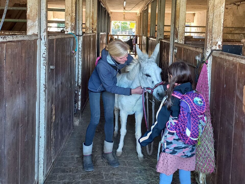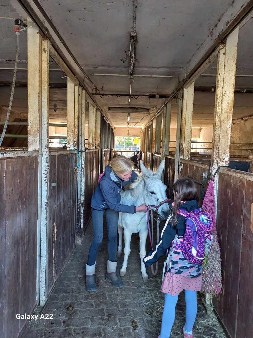 Evin zeigte sich von Anfang an mutig und begegnete den Tieren ruhig. Max und Noah fanden nach der ersten Kontaktaufnahme mit den „Grautieren“ eine weitere wichtige Aufgabe auf dem Eselhof, nämlich das Aufsammeln der Eseläpfel, was sie sehr gewissenhaft und ausdauernd durchführten.