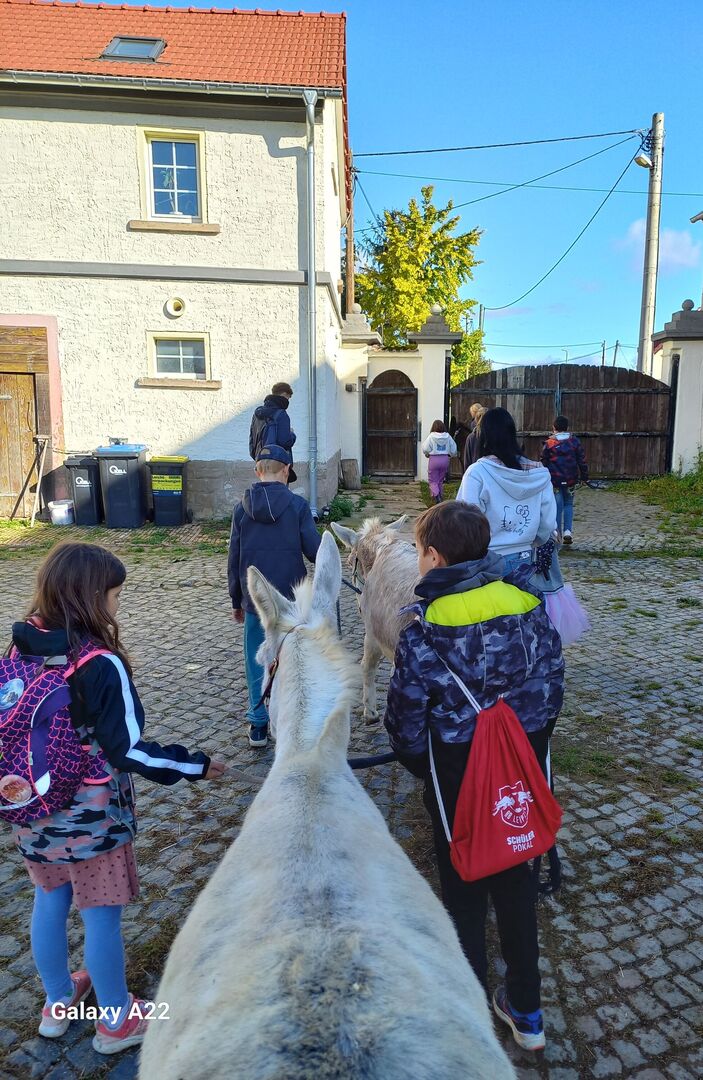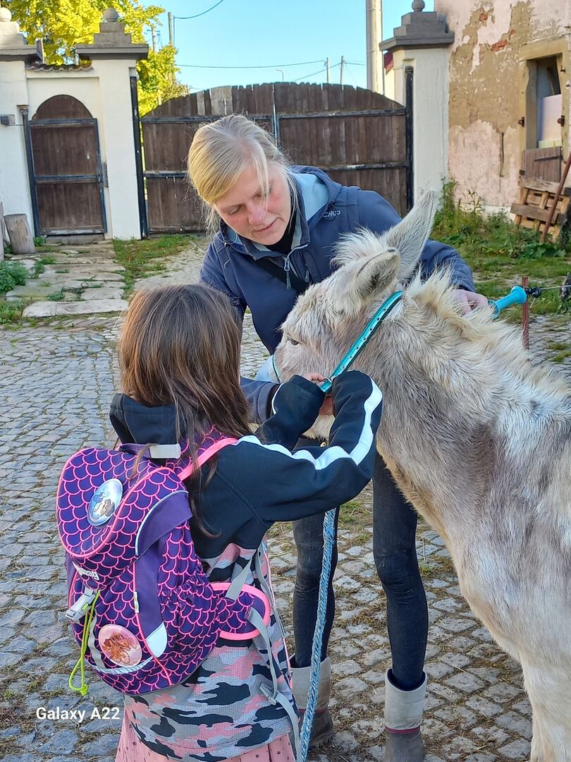 Drei Kinder der Wohngruppe 1 aus Markkleeberg erwarteten den Dienstbeginn der Erzieherin Kathrin Krüger am Montag, 13. Oktober, schon ganz aufgeregt und starteten gemeinsam mit unserer Praktikantin Kim nach Rüssen-Kleinstorkwitz. Dort trafen wir die Kinder und Erzieher der Tagesgruppe Großdalzig und wurden gleich von vier Eseln und der Besitzerin des Hofes begrüßt.