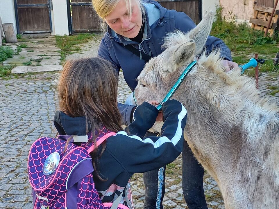 Rosalie schaute sich zu Beginn nur an, wie die anderen Kinder im Gehege mit den Eseln umgingen. Nach einiger Zeit probierte sie es dann auch aus und in Begleitung von Kathrin traute sie sich zu, die Esel zu streicheln und zu bürsten