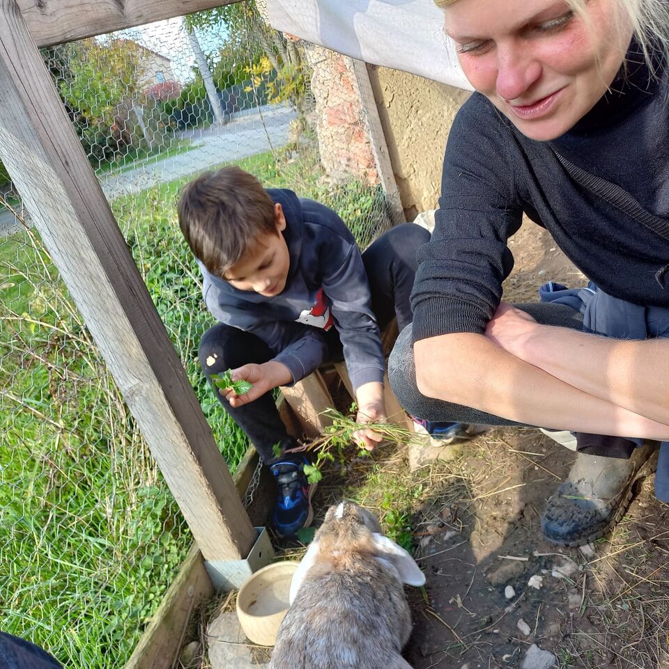 Nach der Rückkehr auf den Hof blieb den Kindern noch Kuschelzeit mit den Eseln, und auch die Kaninchen erhielten noch eine Kuschel- und Fütterungseinheit durch die Kinder.