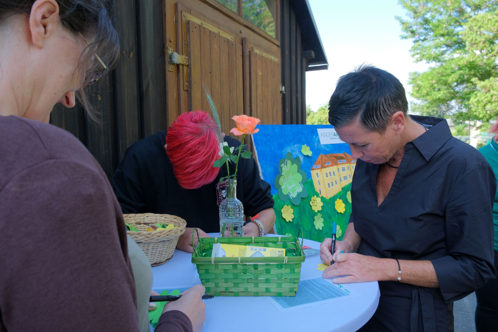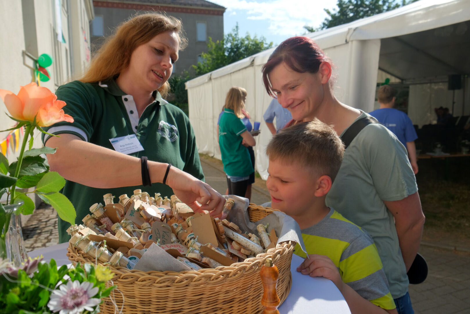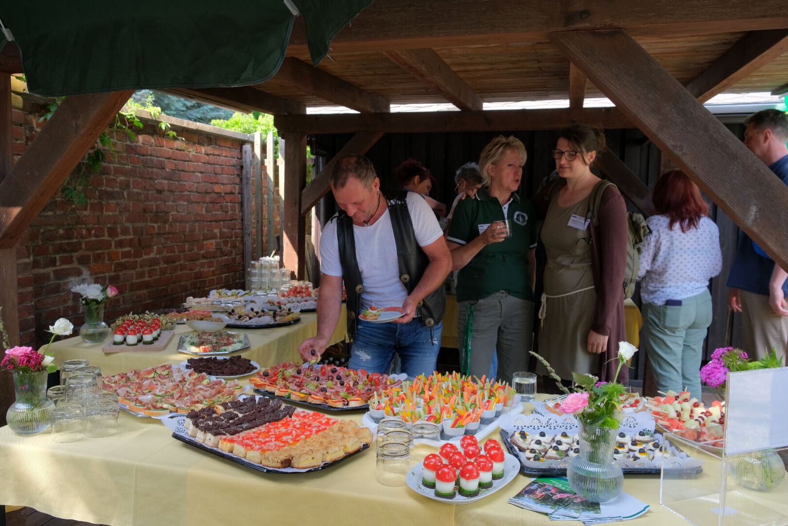 Fleißige Feen hatten ein überwältigendes Buffet mit Leckereien vorbereitet, das die Gäste begeistert stürmten. Wer das Haus noch nicht gesehen hatte, konnte sich in einer Führung einen Einblick verschaffen. Zur (über) 30-jährigen Geschichte gab eine Ausstellung mit verschiedenen Plakaten Auskunft. Für gute Wünsche standen kleine Kleeblatt-Zettel bereit, die die Gäste auf eine Leinwand kleben konnten. Und als kleines Erinnerungs-Geschenk durften sich die Gäste selbst gemachtes Salz mit einem Kleeblatt-Anhänger mitnehmen.