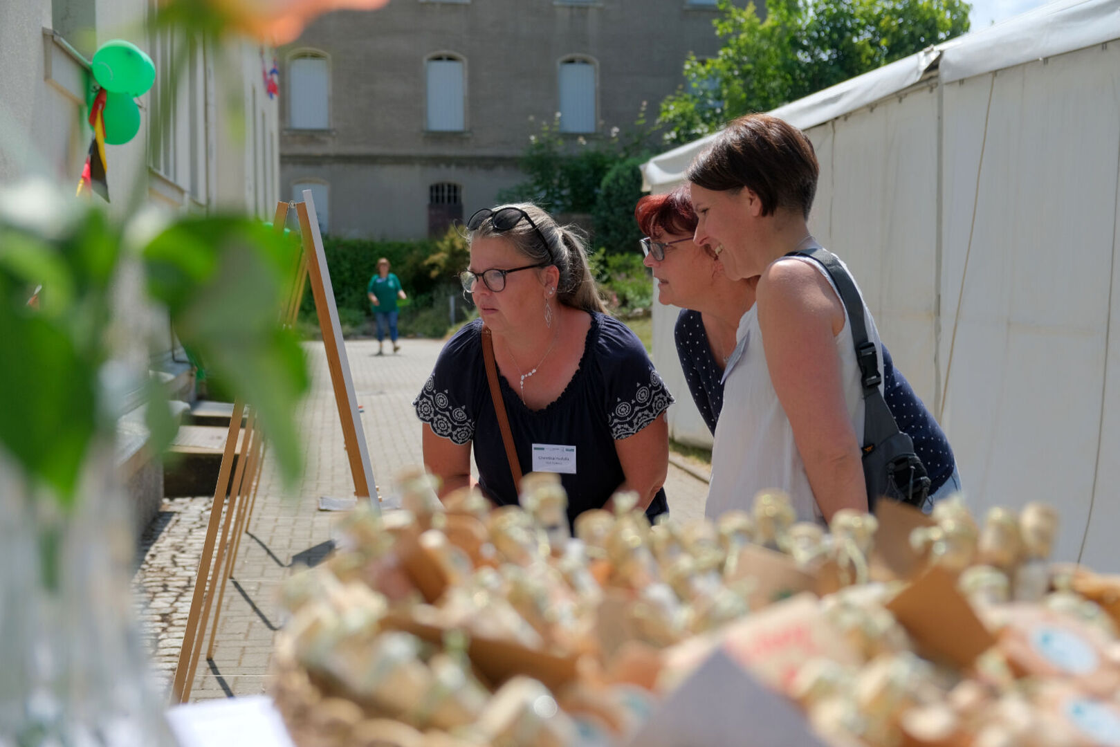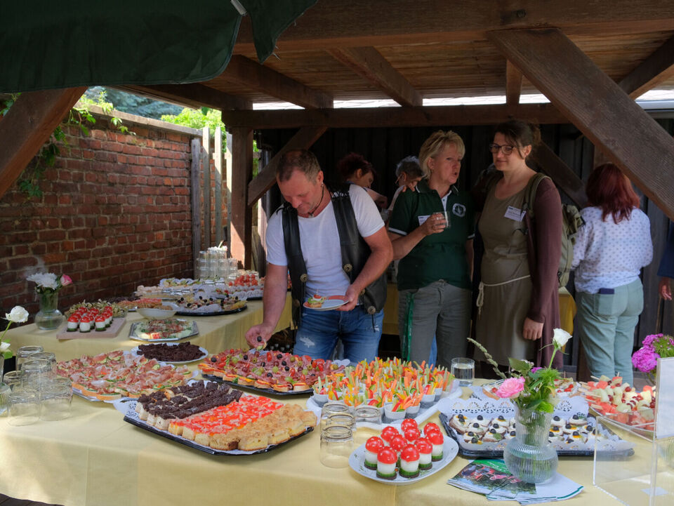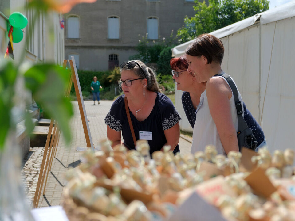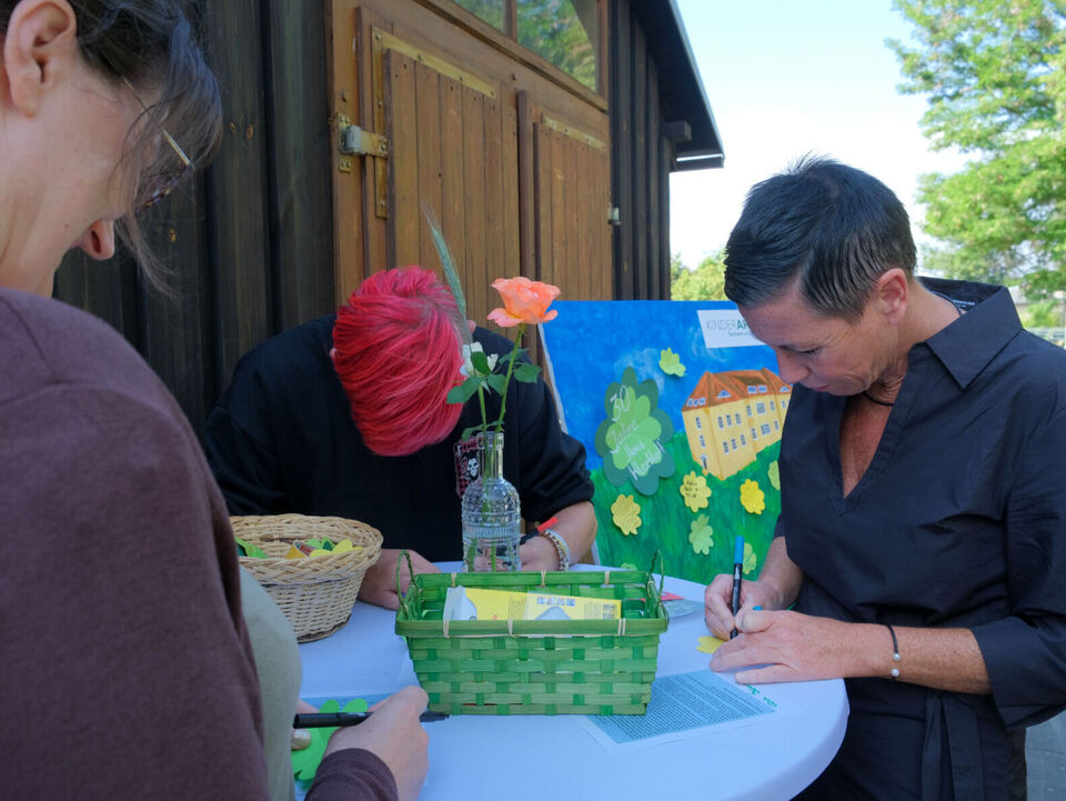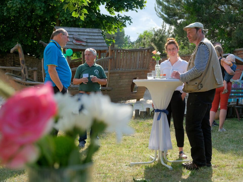 Fleißige Feen hatten ein überwältigendes Buffet mit Leckereien vorbereitet, das die Gäste begeistert stürmten. Wer das Haus noch nicht gesehen hatte, konnte sich in einer Führung einen Einblick verschaffen. Zur (über) 30-jährigen Geschichte gab eine Ausstellung mit verschiedenen Plakaten Auskunft. Für gute Wünsche standen kleine Kleeblatt-Zettel bereit, die die Gäste auf eine Leinwand kleben konnten. Und als kleines Erinnerungs-Geschenk durften sich die Gäste selbst gemachtes Salz mit einem Kleeblatt-Anhänger mitnehmen.