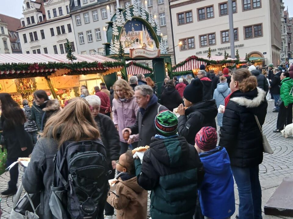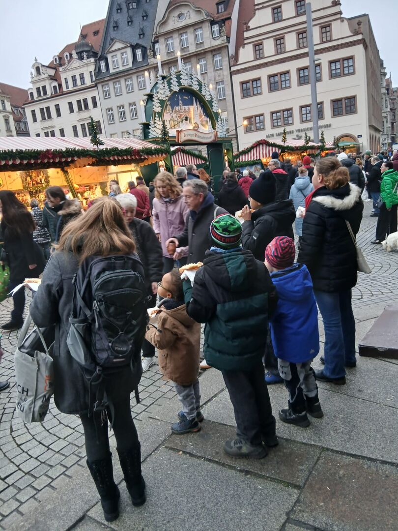 Doch bevor es dorthin ging, tauchten wir auf dem Marktplatz in das bunte Getummel des Weihnachtsmarktes ein und stärkten uns mit Lángos, Kräppelchen und gebrannte Mandeln mit Nutellamantel – sowas gabs noch nie! Wir sahen uns die Dekorationen an den Ständen an und ließen uns trotz der großen Menschenmenge von der weihnachtlichen Stimmung inspirieren.