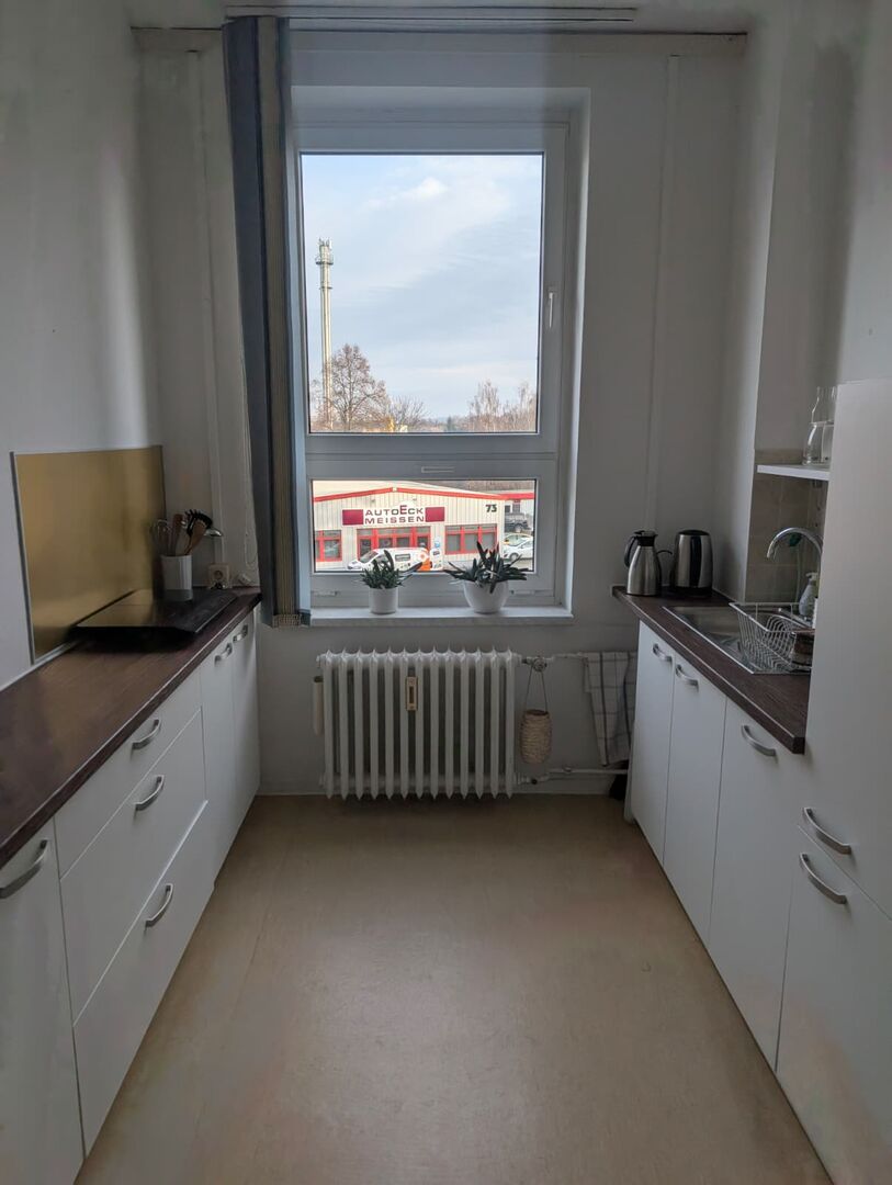 An die Stelle des alten Sammelsuriums ist eine moderne, funktionale und wunderschöne Küche getreten! Sie erstrahlt in einem freundlichen Weißton, ergänzt durch eine warme, dunkle Arbeitsplatte in Holzoptik.