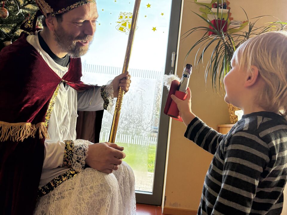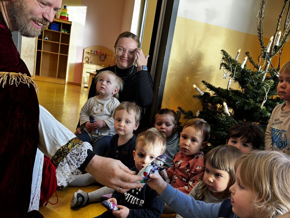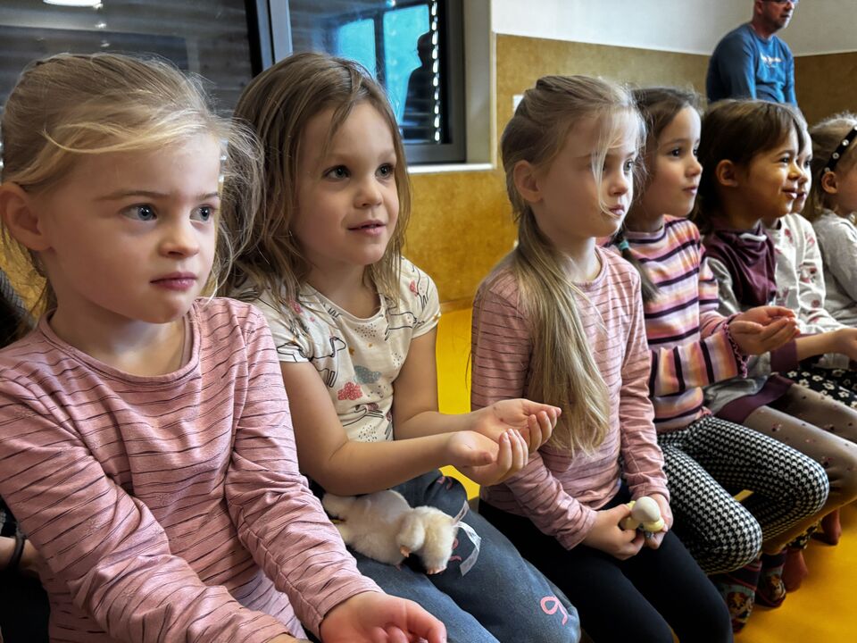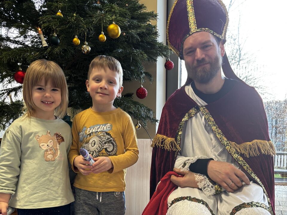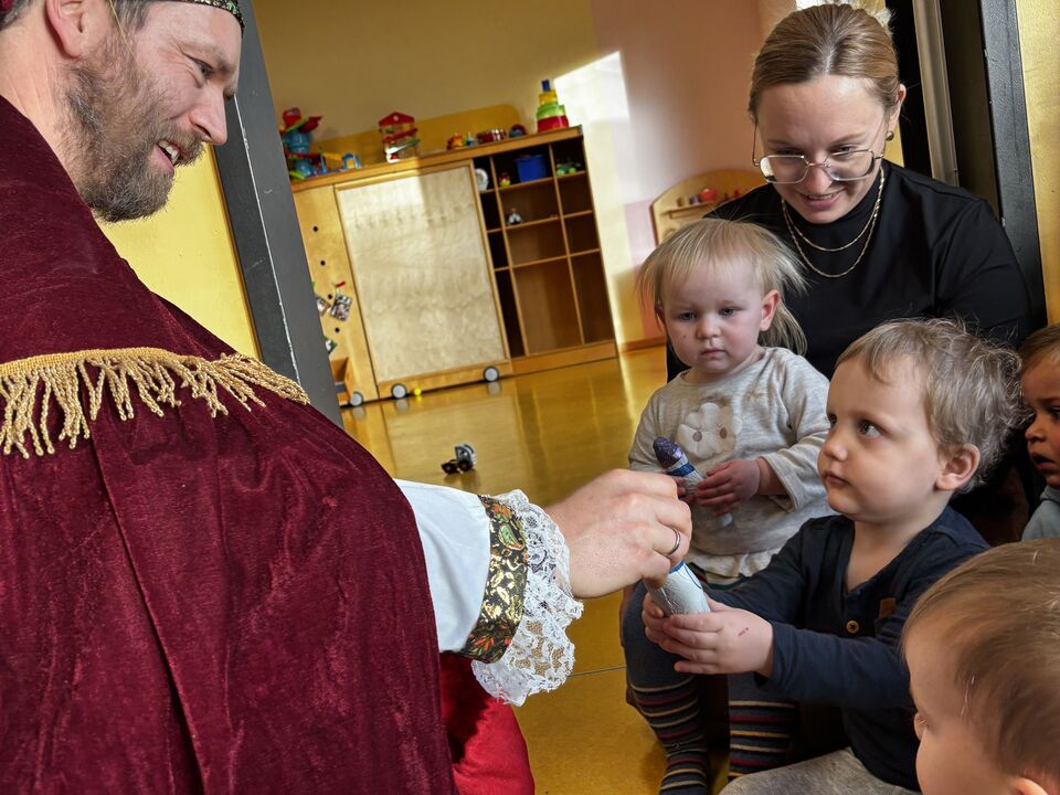 „Wo ist denn Dein Bart?“ fragt Leon und gespannt hörten alle der Antwort des Nikolaus zu. Was alles noch so zum Nikolaus gehört und welche wichtige Aufgabe er hat, das war ebenfalls Teil des Besuches. Bei der Geschichte vom Nikolaus aus Myra konnten dann alle Kinder ein Teil davon werden, indem sie Bewegungen nachahmten.