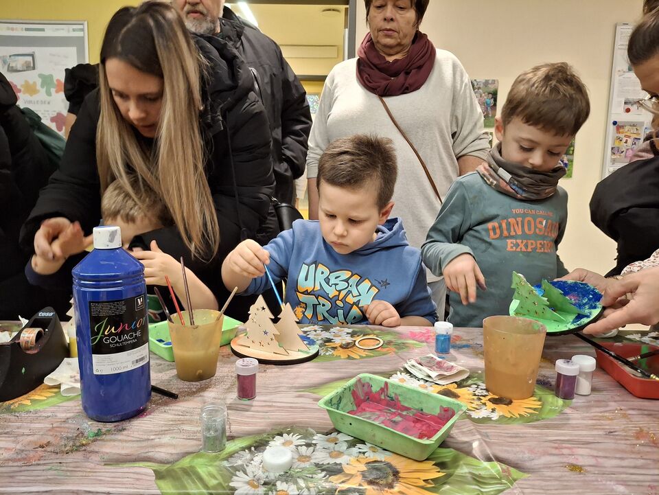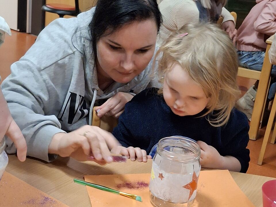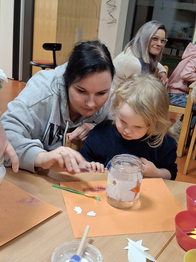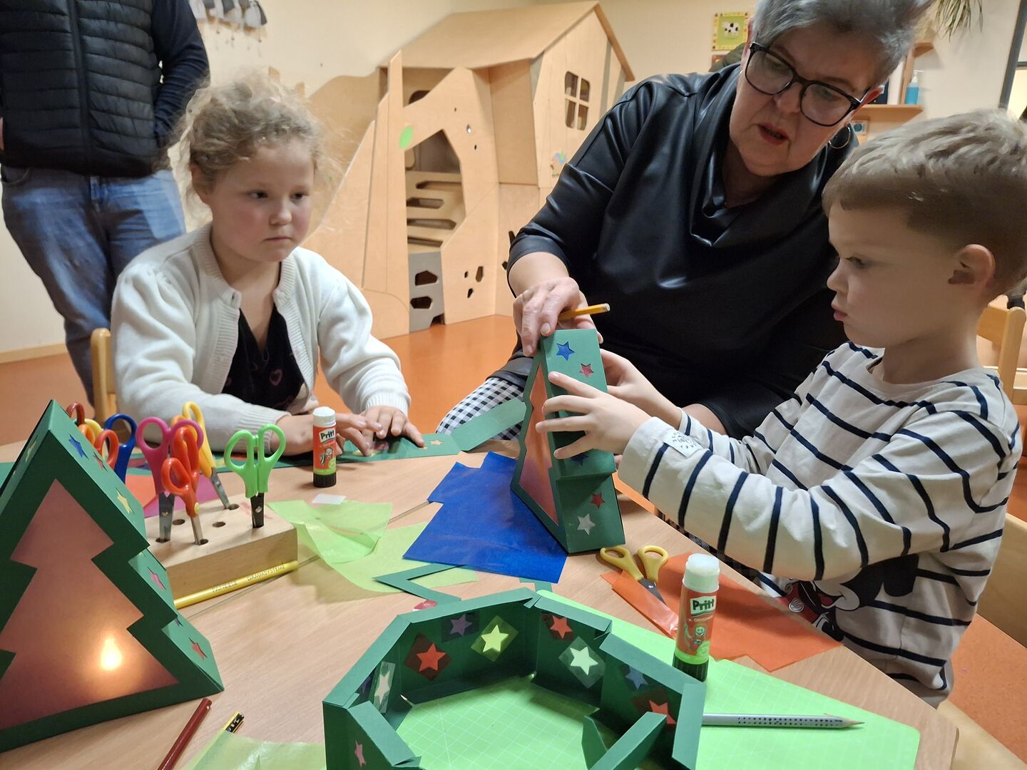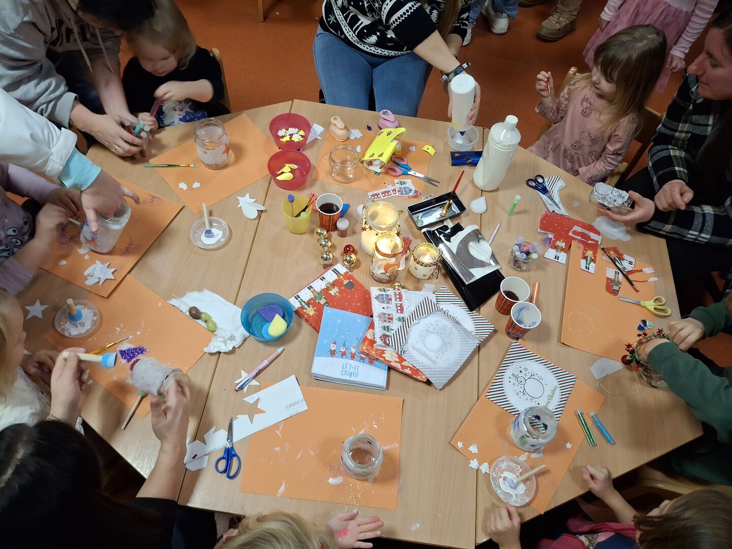 Im Krippenbereich konnte mit verschiedensten Materialien ein Adventskranz für die kommende Adventszeit gestaltet werden. Nebenan im Roten Bereich begrüßten die Fachkräfte die Gäste mit verschiedensten Bastelangeboten. Ob ein winterliches Schüttelbild, welches aus Papptellern hergestellt wurde oder ein leuchtender Weihnachtsbaum. Auch an Serviettentechnik konnte sich der ein oder andere probieren und dabei entstanden wunderschöne Teelichtgläser.