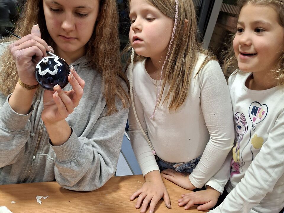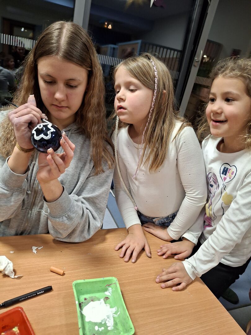 Wer noch etwas Baumbehang für seinen Weihnachtsbaum suchte, fand im Blauen Bereich genau das Richtige. Hier konnte man mit Stift und Farbe Christbaumkugeln gestalten oder aus verschiedenen Zapfen kleine Wichtel entstehen lassen.