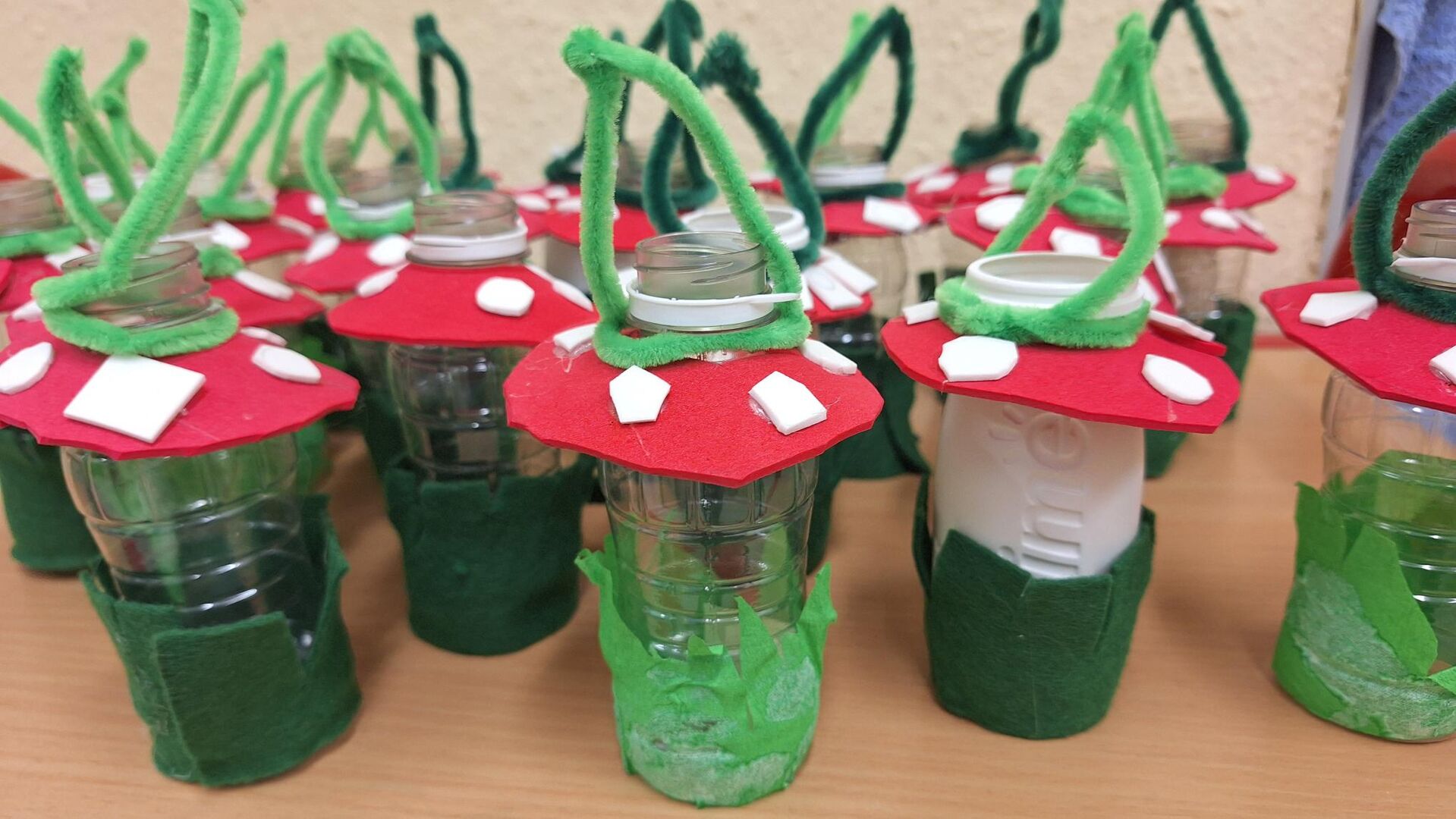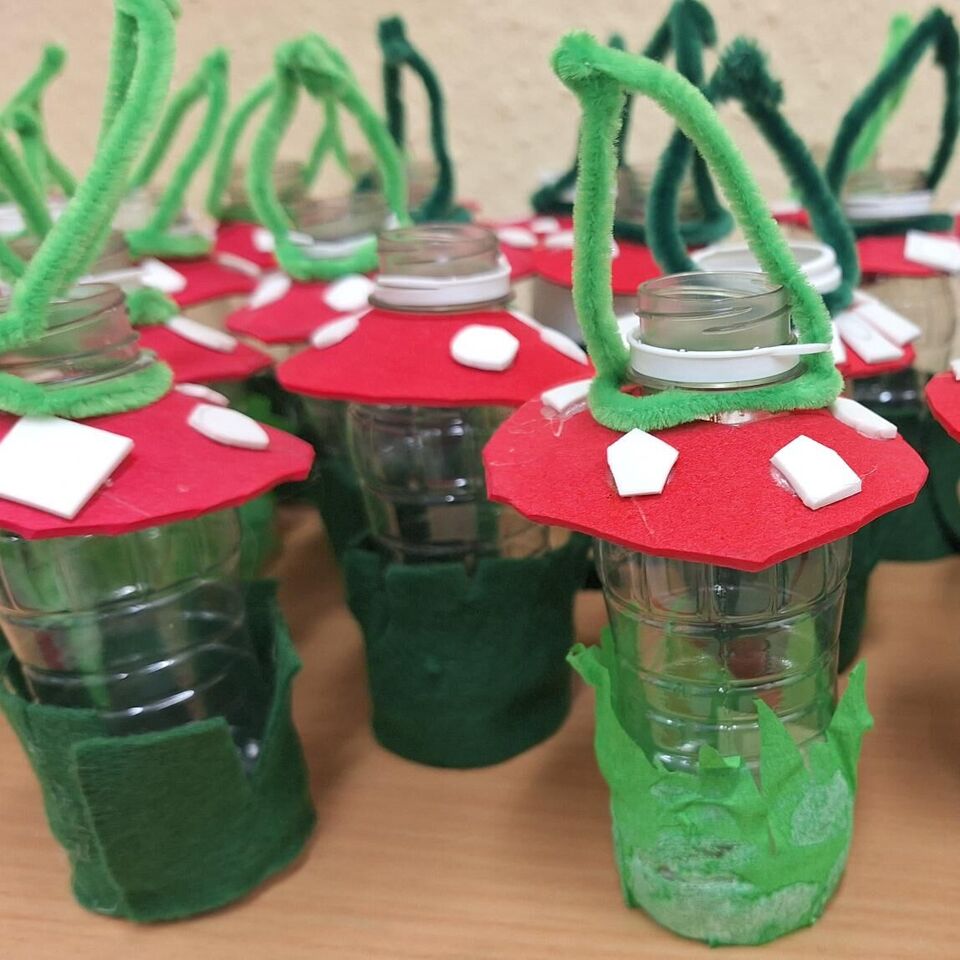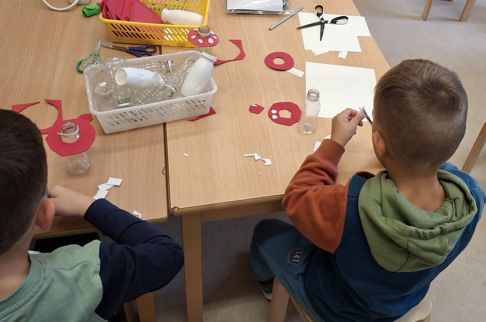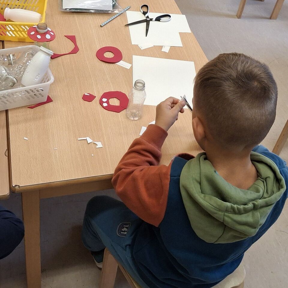 Am Dienstag wurde geschnitten und geklebt. Während die kleinen Sterntaler Luftballonlaternen mit Kürbissservietten gestalteten, entstanden bei den großen Sterntalern kleine Fliegenpilzlaternen aus kleinen Plasteflaschen.