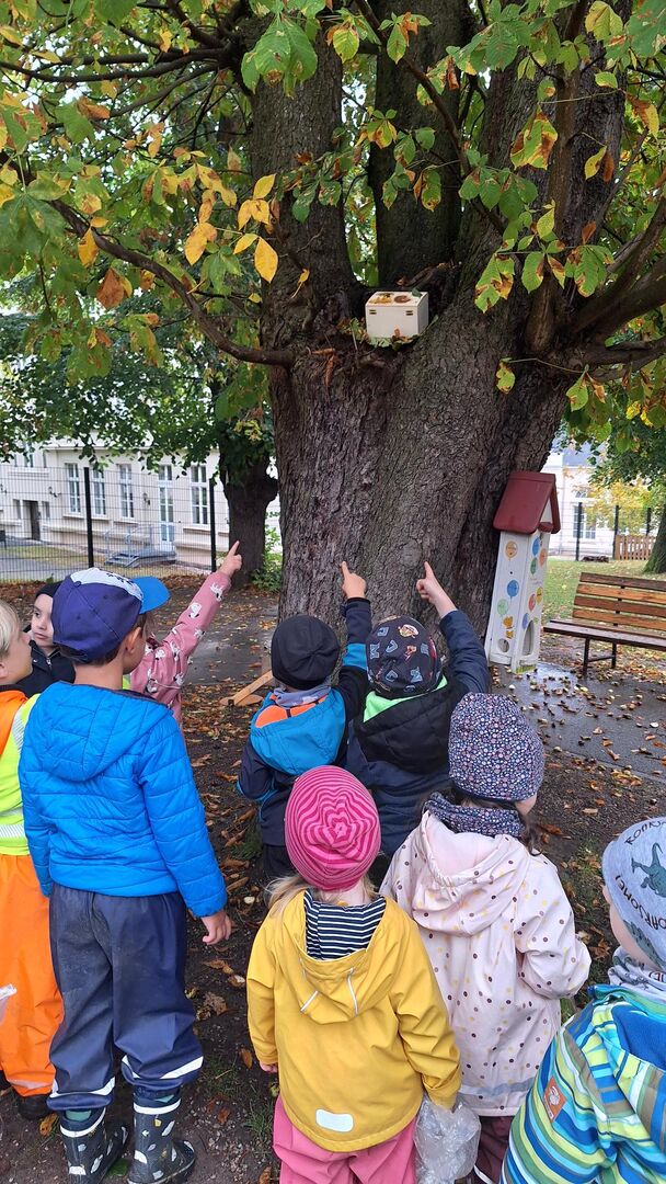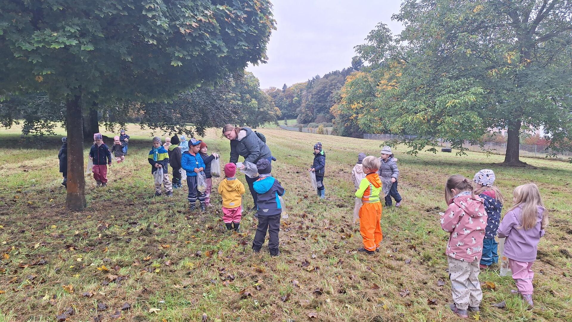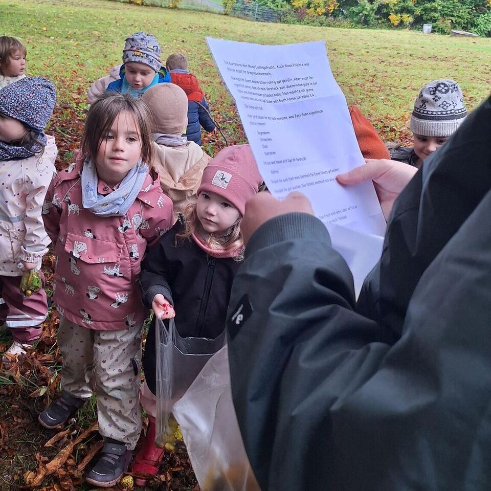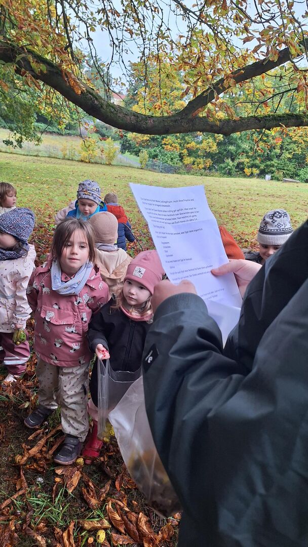 Am Mittwoch bekamen die großen „Sterntaler“ einen Brief vom kleinen Igel „Isidor“, welcher uns zu einer kleinen Herbstschatzsuche in den nahegelegenen „Krankenhauspark“ einlud. An verschiedenen Bäumen fanden die Kinder Briefe mit verschiedenen Aufgaben, deren Lösungen uns dem gut versteckten Schatz ein Stück näherbrachte. Letztendlich war die Schatztruhe in unserem großen Kastanienbaum im Kinderhaus versteckt, dessen Inhalt für Begeisterung bei den Kindern sorgte.