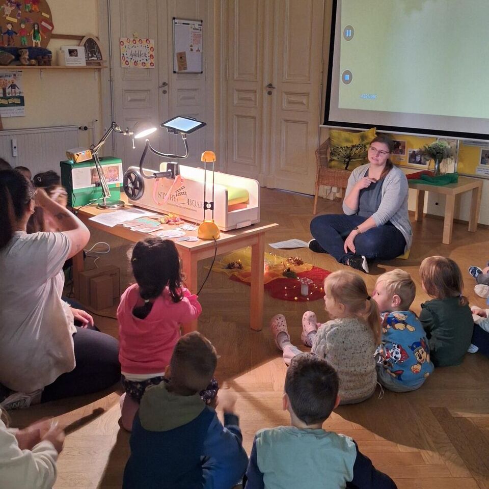 Die Woche begann mit einem großen Hausmorgenkreis, in welchem einige Kinder uns die Geschichte von der kleinen Waldmaus und dem Igel mit einem „Story- Board“ erzählten. Schon im Vorfeld bereiteten sie dafür alle notwendigen Utensilien vor. Mit herbstlichen Liedern und unseren Segenspruch klang unser Morgenkreis aus.