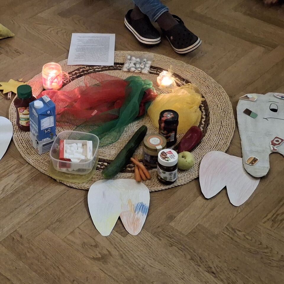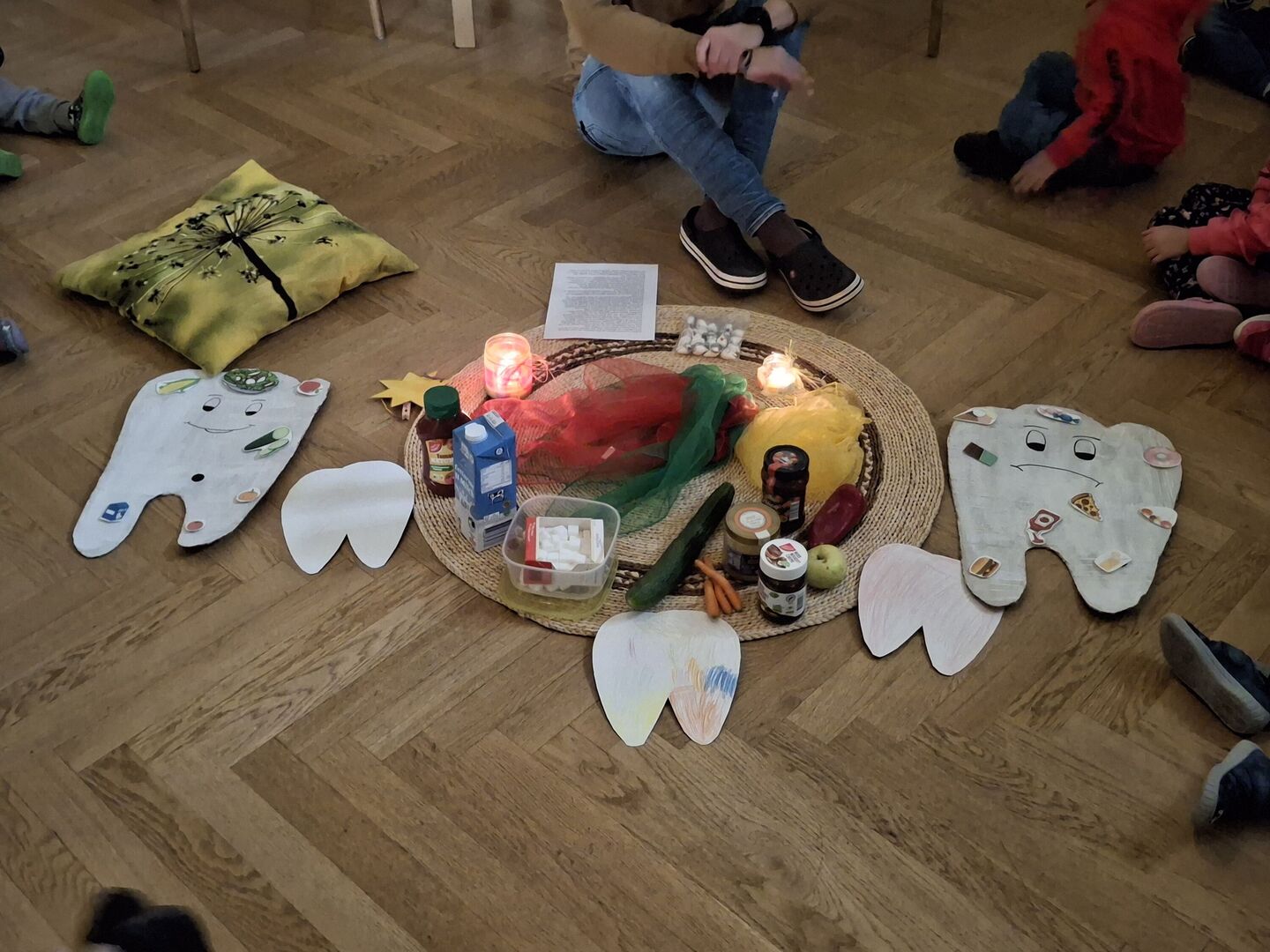 In diesem Jahr nutzten wir den großen Hausmorgenkreis, um alle Sterntaler daran zu erinnern, wie wichtig das Zähne putzen für ist. In unserer großen Runde kamen viele Fragen auf. „Welche Lebensmittel sind gesund und stärken unsere Zähne?“ „Welche Lebensmittel schaden unseren Zähnen, wenn man zu viel von ihnen isst und die Zähne danach nicht gründlich putzt?“