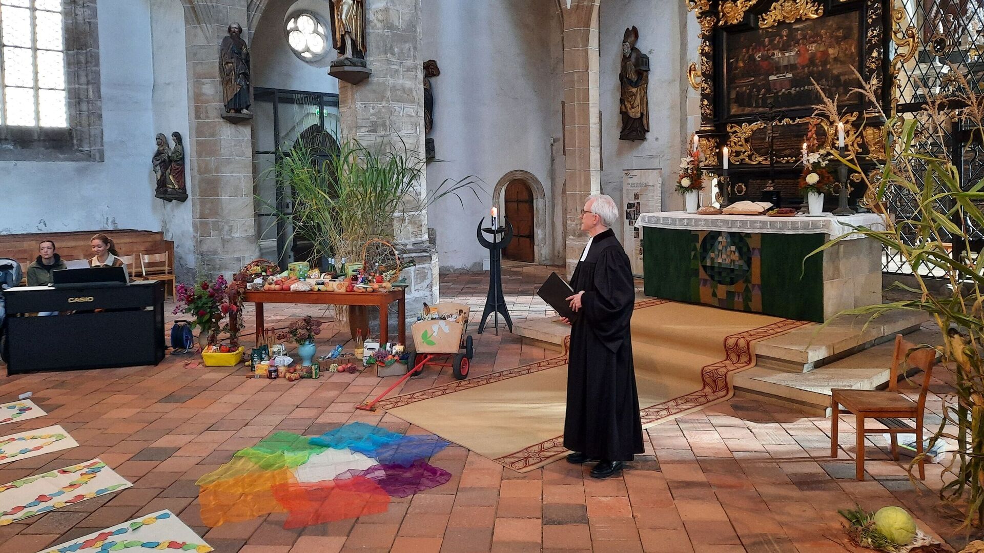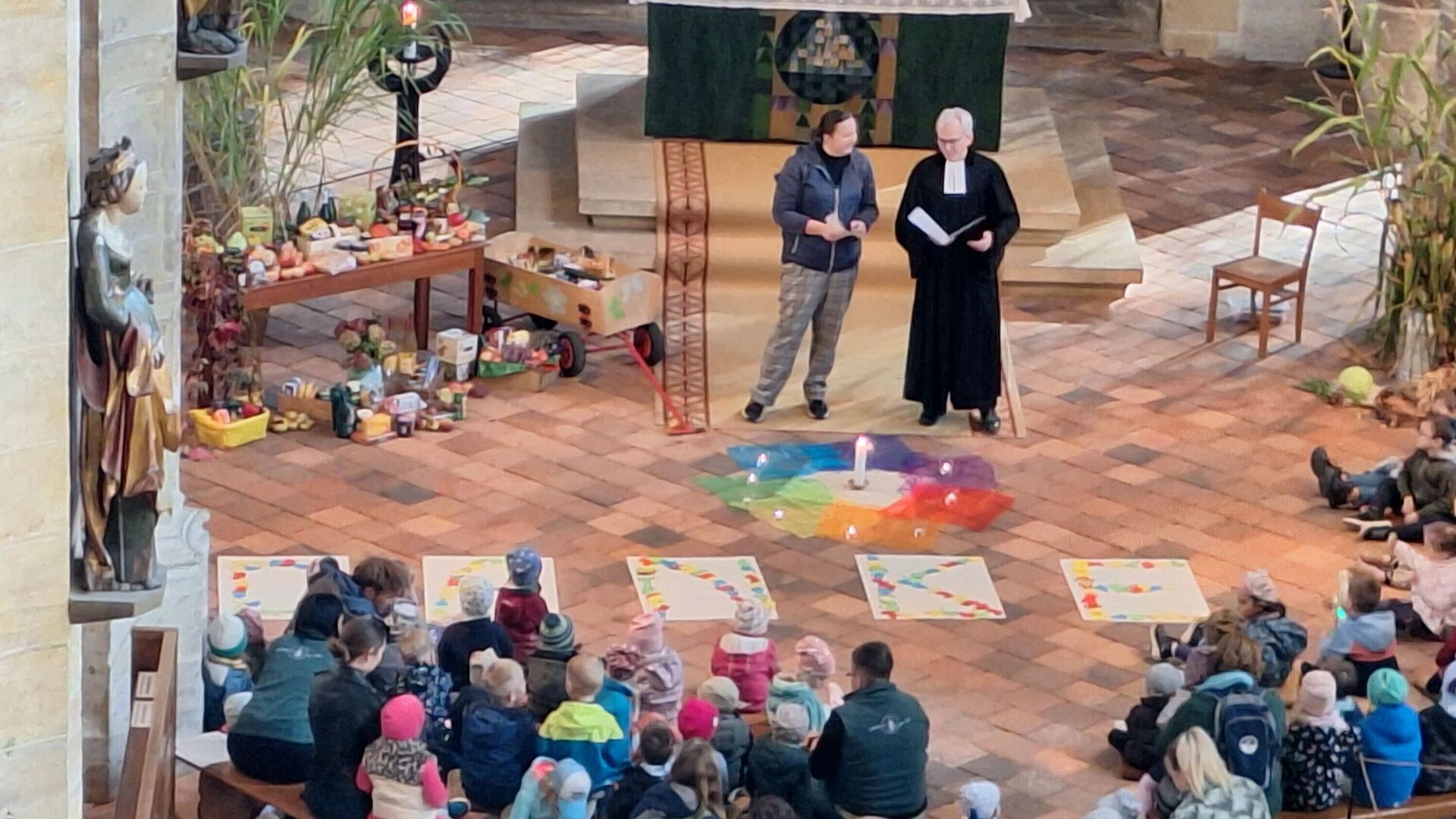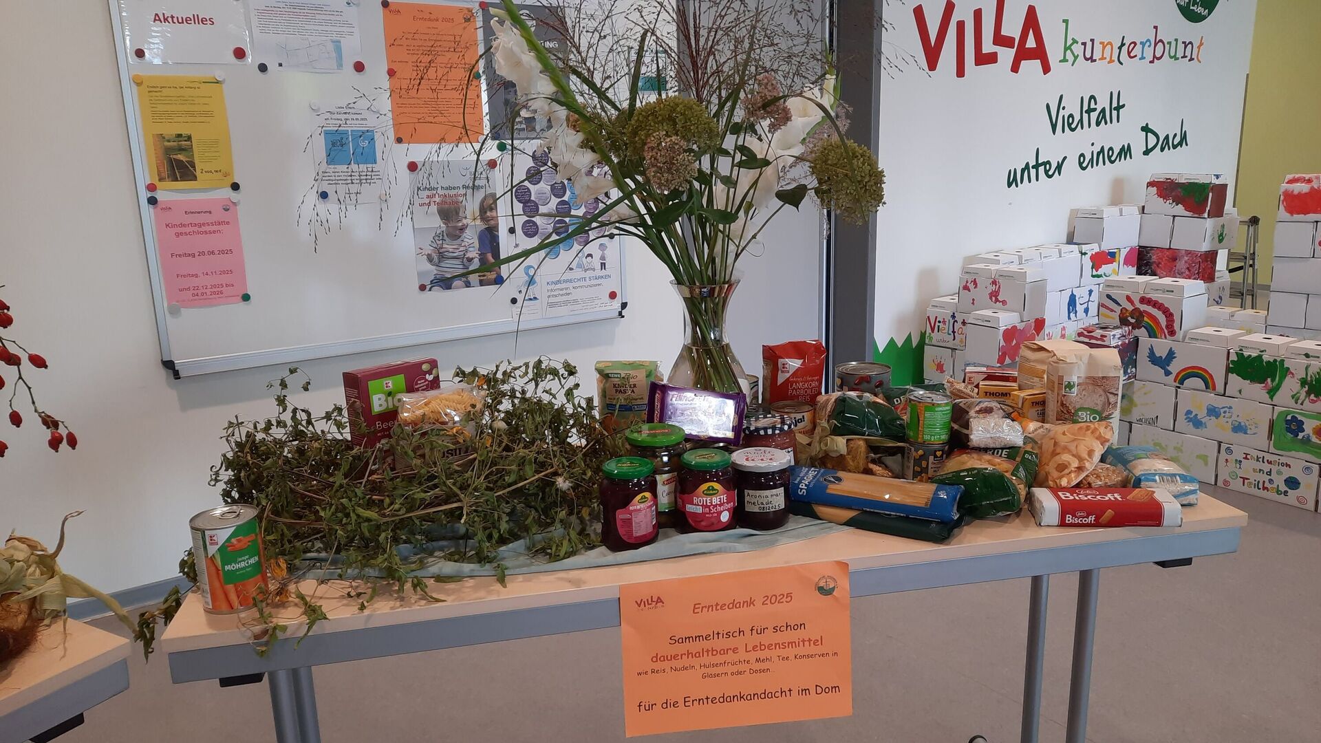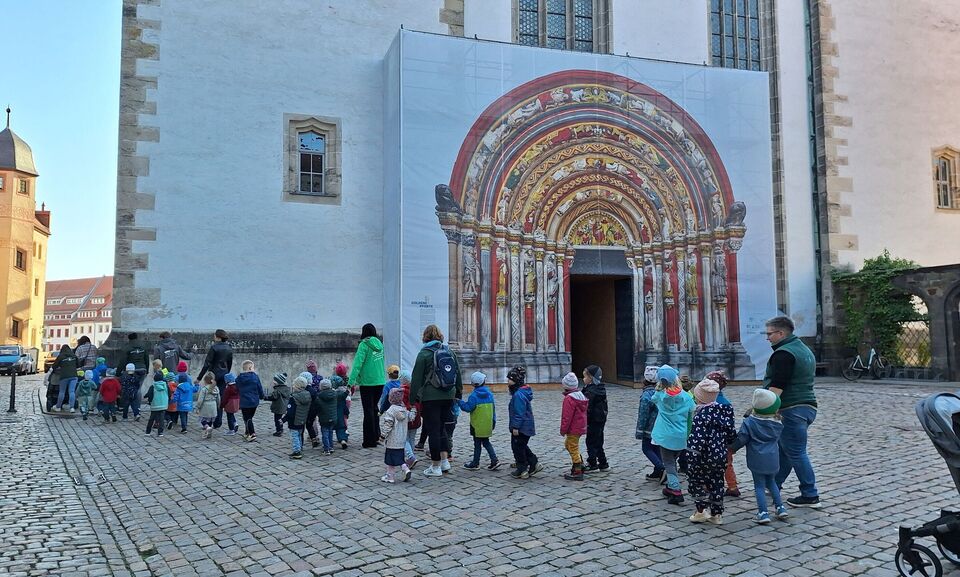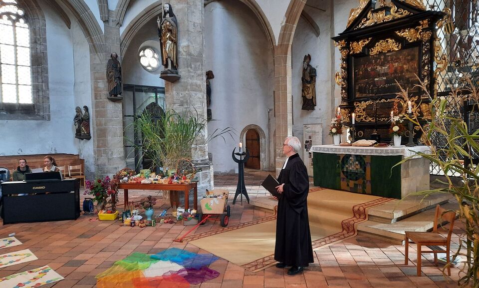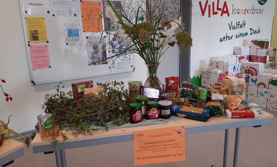 Die Vielfalt des Lebens wird in der Herbstzeit sehr deutlich, besonders beim Ernten. In dieser Zeit ernten wir nicht nur verschiedene Gemüse- und Obstsorten sondern nehmen auch all die Farben auf, die uns durch graue Wintertage tragen, singen viele Lieder - „Der Herbst, der Herbst, der Herbst ist da!“ - und hören verschiedene Geschichten für die Seele und besinnen uns der Dankbarkeit. Wir überlegen gemeinsam mit den Kindern, für was wir alles dankbar sein können. Ganz praktisch wird das beim Ernten, Verarbeiten und Essen erlebt. Aus den Früchten, die uns die Eltern mitbringen oder die wir selber in unserem Kitagarten ernten können, stellen wir selber mit den Kindern Marmelade, Saft, Trockenobst, Zucchini-Kuchen und anderes her. Manches essen wir gleich und erleben den verschiedenen Geschmack, anderes machen wir haltbar. Diese und andere mitgebrachte Lebensmittel der Familien bringen wir mit zu unserer Erntedankandacht mit Pfarrer Dr. Wiegand und Musikpädagogin Louisa Möbius am 30.09.2025 in den festlich geschmückten Freiberger Dom. Dort danken wir Gott für seine vielfältigen Geschenke und dass es er da ist und sich um uns sorgt.