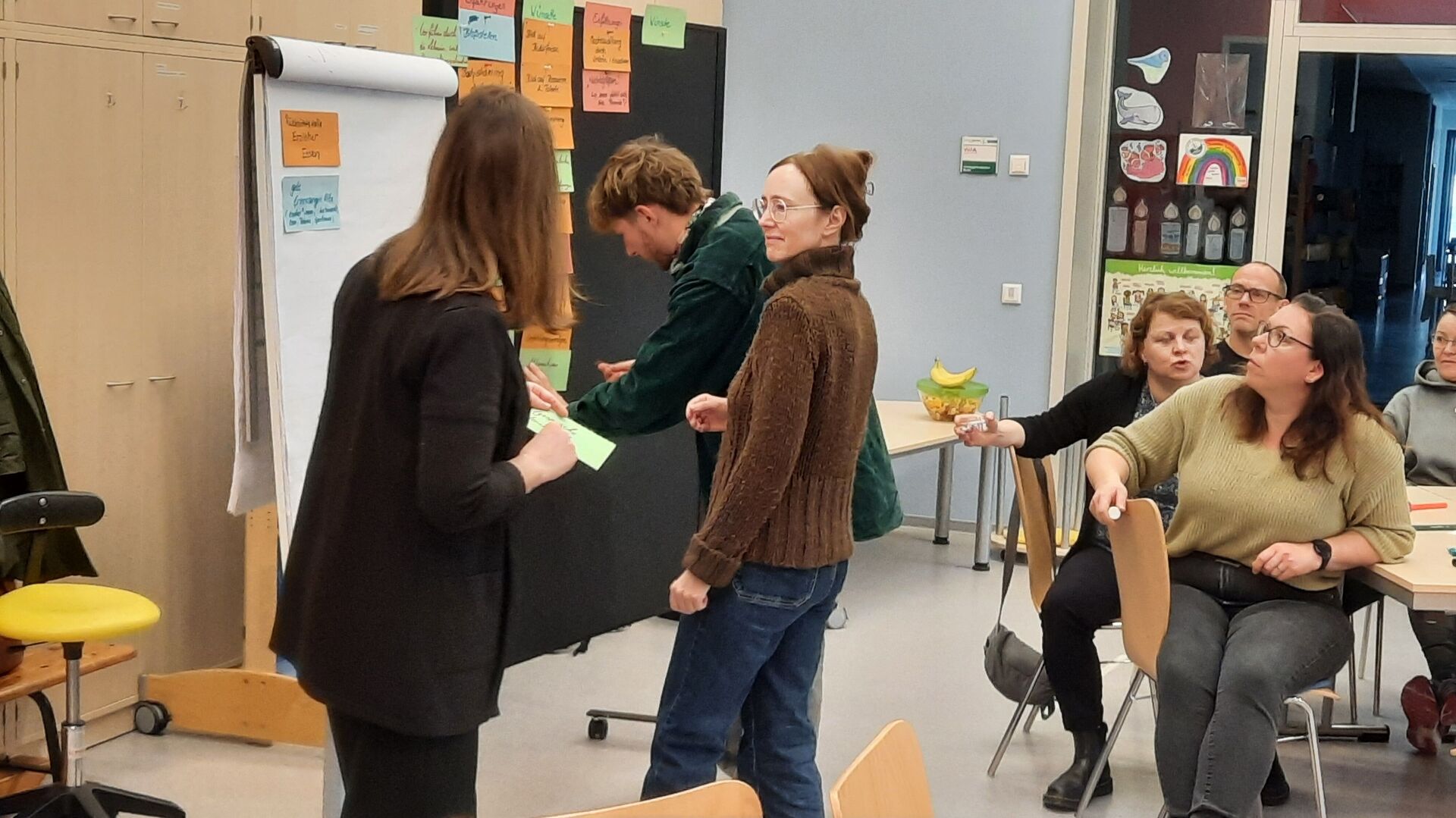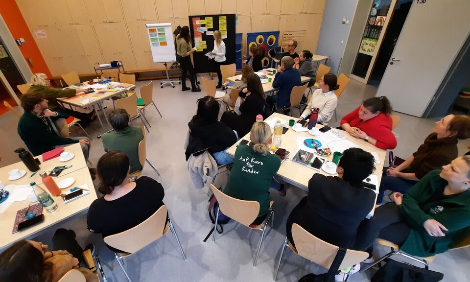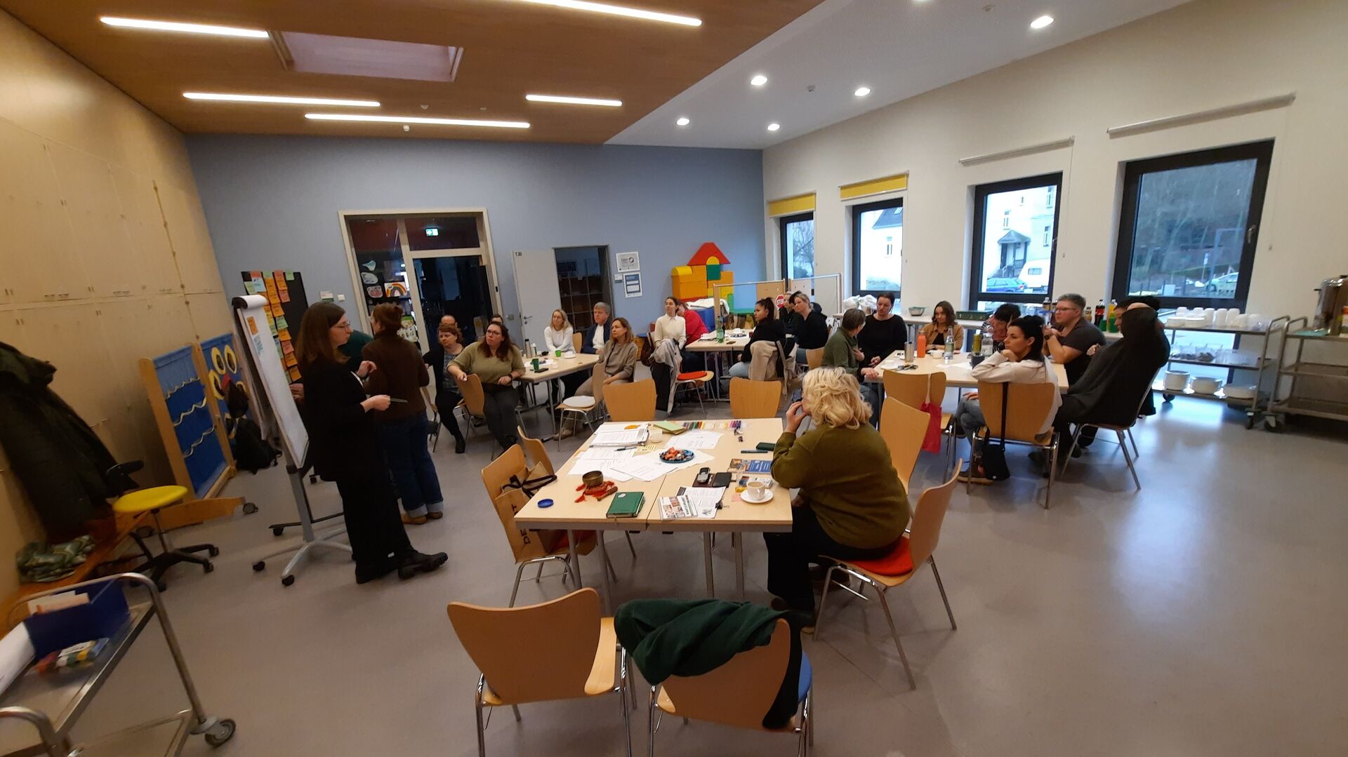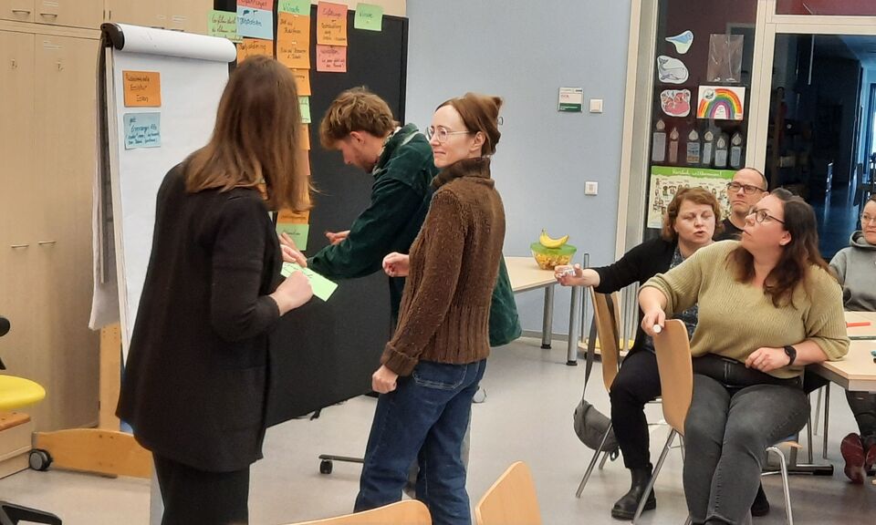 Gemeinsam unterwegs zu sein und sich immer wieder neu zu verständigen und zu versichern, wie wir zusammen zum Wohle der uns anvertrauten Kinder und Familien arbeiten möchten, ist eine wichtige Aufgabe – nicht nur für neue Mitarbeitende. Deswegen haben wir uns am letzten Samstag, am 17.01.2026, als gesamtes Haus-Team mit pädagogischen Fachkräften, Hausmeistern, Hauswirtschafterinnen und Ehrenamtlichen einen Tag in der Kita einmal ohne Kinder zusammengefunden, um uns mit Hilfe von Katrin Leschak, Kitaleitung in der Kita Kinderhaus „Sterntaler“ in Crimmitschau und Projektbegleitung für Kinderschutz im Verein, auf den Weg zu machen, einen Verhaltenskodex für unser Haus zu erarbeiten. Ein offener und reger Austausch in Kleingruppen und im Plenum zu Erfahrungen in der eigenen Kindheit, Erwartungen an Mitarbeitende in pädagogischen Einrichtungen, zu Werten, die uns verbinden, Verhaltensregeln im Miteinander, Stressfaktoren und Bewältigungsstrategien im Kita-Alltag brachte uns einander näher und offenbarte neben aller Individualität auch viele Gemeinsamkeiten. Zusammen essen ist ebenfalls gemeinschaftsstiftend. Jede*r hatte etwas mitgebracht, sodass fürs Mittagsessen ein vielfältiges Buffet entstand und wir uns in fröhlich Runde für die Weiterarbeit am Nachmittag stärkten. Mit allen Ergebnissen des Tages arbeiten wir nun in einer Kleingruppe weiter und entwickeln unseren eigenen Verhaltenskodex.