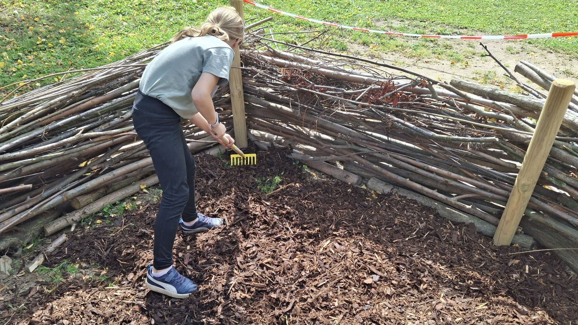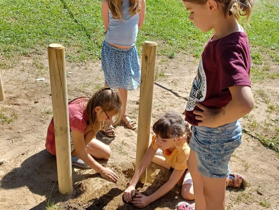 Zu Beginn des neuen Schuljahres haben wir angefangen, ein neues Element in unserem Außengelände zu bauen, wo sich die Kinder auch mal zurückziehen können. Dank unseres Hausmeisters, der uns viele Pfosten organisierte und die ganzen Äste der Weiden gesammelt hatte, konnten wir pünktlich im August loslegen und das neue Projekt starten lassen. Zuerst mussten die Pfosten in den Boden gebuddelt werden und die Kinder und Erzieher:Innen merkten schnell, dass die Erde sehr fest war. Nach 20 Jahren und vielen Füßen, die über die Stelle gelaufen sind, musste ordentlich geschaufelt und gehackt werden. Wurzeln, Steine und fester Boden sorgten für anstrengende Nachmittage. Alle waren aber froh, als die 12 Pfosten im Boden befestigt waren. Nun konnten wir alle Äste heranholen und unsere „Horties“ packten ordentlich mit an. So wurden alle Äste, und wir reden da von wirklich viel, einmal quer durch das Gelände getragen. Unter Anleitung konnten die Kinder nun mit kleinen und großen Astscheren das Holz so bearbeiten, dass es gut in die Pfosten gelegt werden konnte. Nach gut 10 Tagen harter Arbeit und dank vieler helfender Hände konnten wir unser neues Weidensofa einweihen und die Helfer testeten es gleich aus. In einem Weidensofa kann man sich reinsetzen und miteinander spielen oder sich unterhalten. Natürlich gibt es auch die Möglichkeit, wie am Anfang beschrieben, es als Versteck zu nutzen. Wir im Hort sind froh, dass wir gemeinsam ein tolles Erlebnis hatten und nun zusammen ein selbstgebautes Projekt haben.