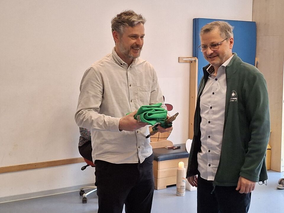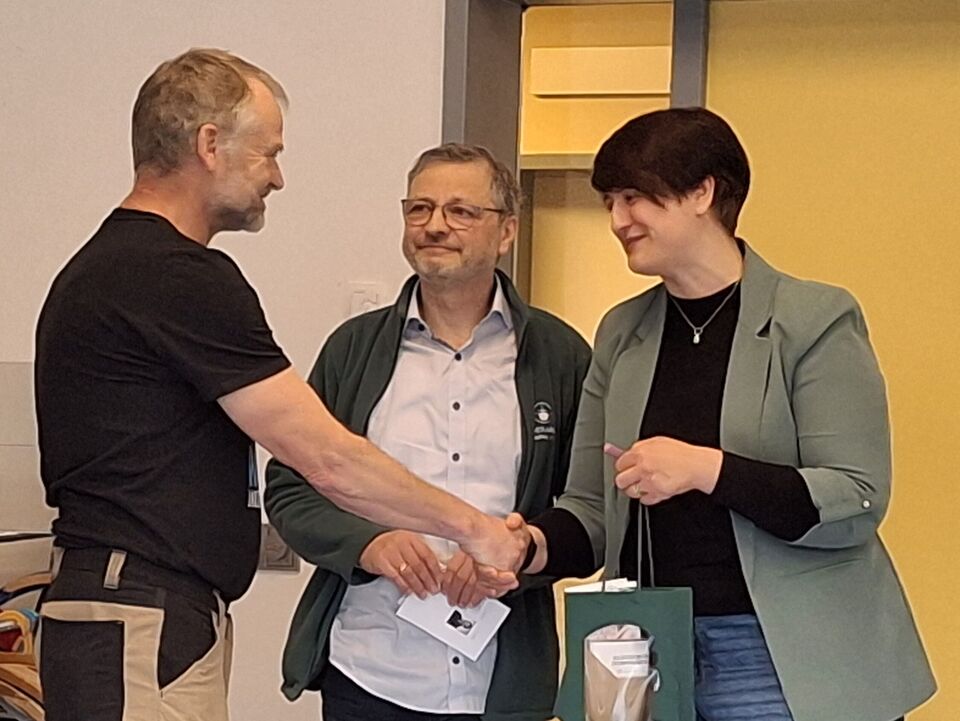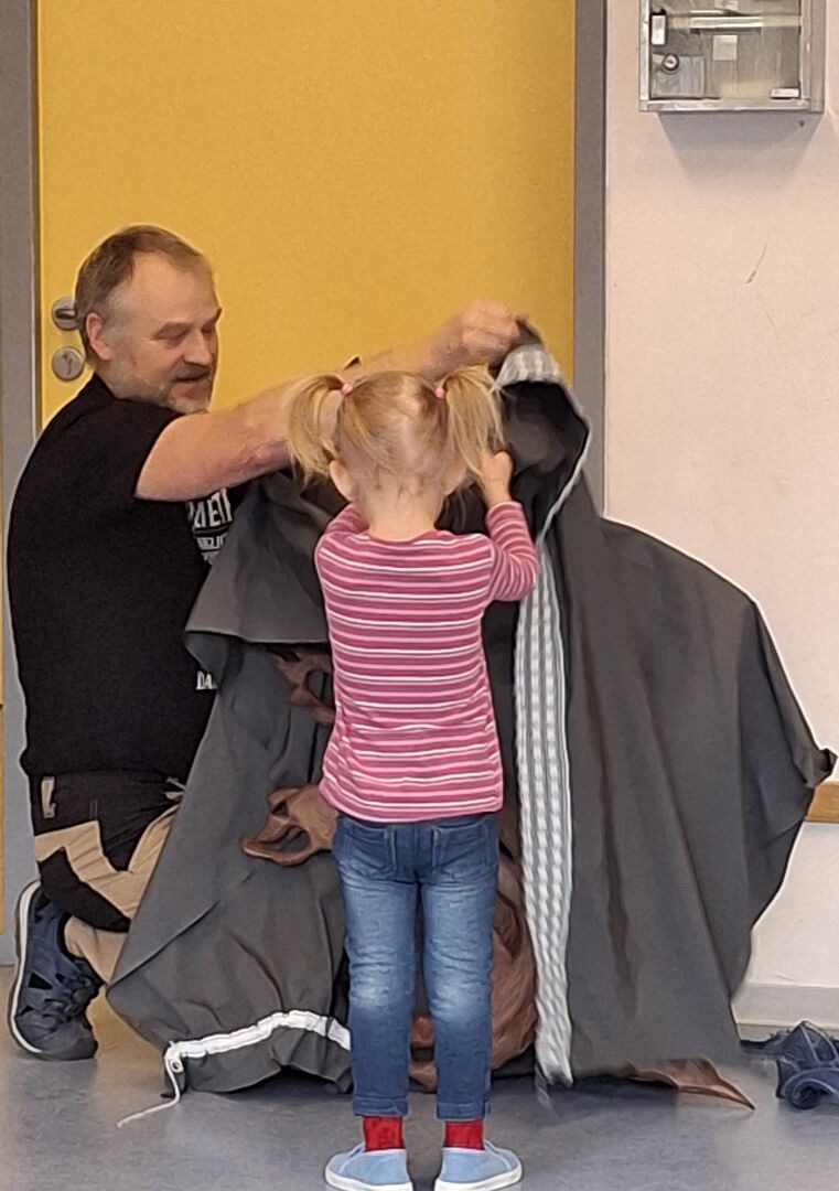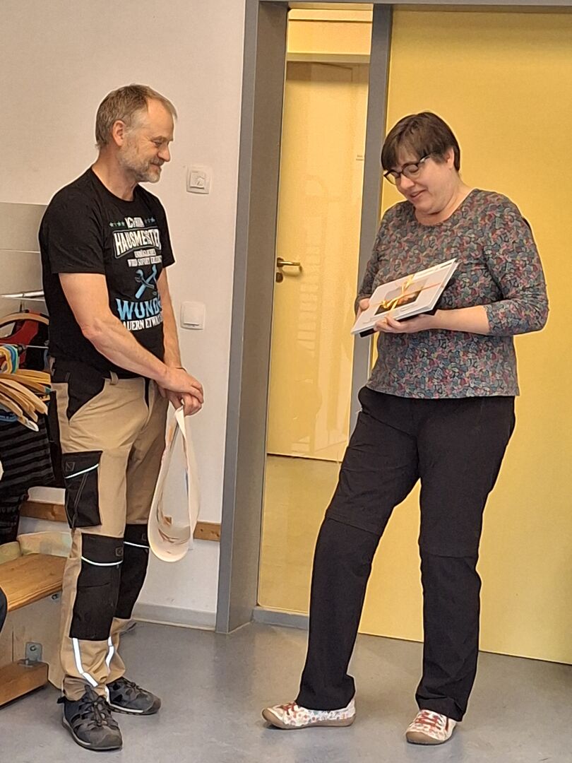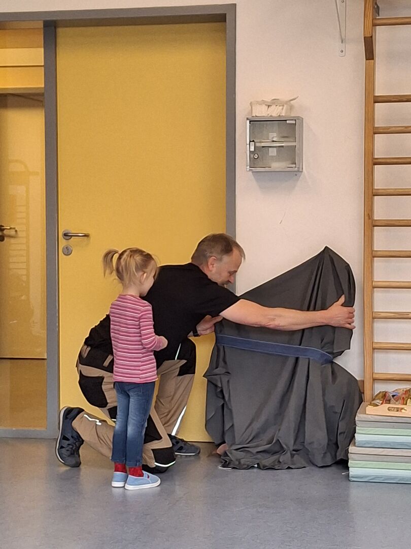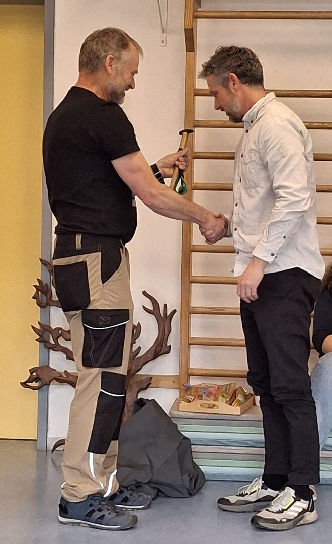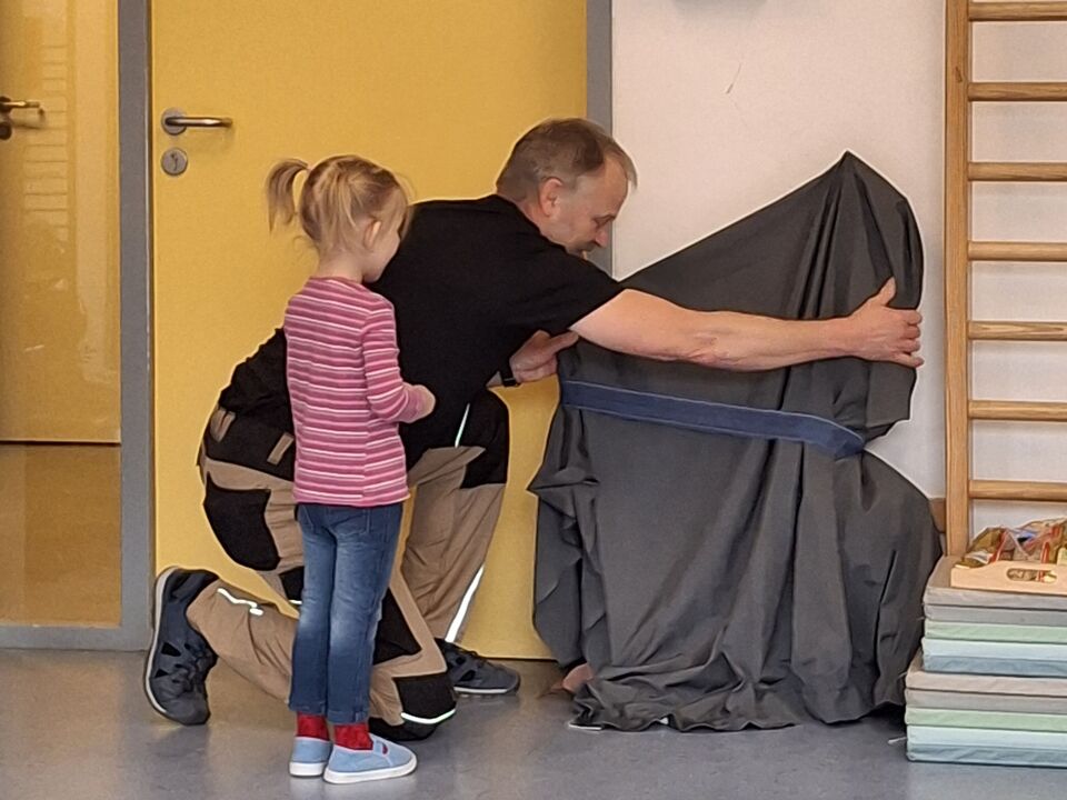 Nach fast 17 Jahren Tätigkeit in unserer Kita haben wir unseren Hausmeister Eckhard Baxa in den Ruhestand verabschiedet. Zum Abschied standen die vielen Spuren im Mittelpunkt, die er in und um die Kita hinterlässt. Wie er zum Abschied sagte: "Es ist nicht EINE Kita, sondern MEINE Kita, die ich verlasse." Genauso hat er seine Arbeit verstanden und unsere Kita vom ersten Tag der Eröffnung bis heute mit geprägt. Wir sagen: "Vielen herzlichen Dank für alle geleistete Arbeit." Vieles, was unser Haus und unser Außengelände prägt, ist von ihm mit geplant, umgesetzt und später gepflegt worden. Vorstand, Fachbereichsleitung und das ganze Team mit den Kindern nutzten den Hausmorgenkreis, um unseren Hausmeister gebührend zu feiern und zu verabschieden. Sinnbildlich bleiben eine Reihe von Holzarbeiten vor Augen - vom Wegweister bis zum Balancierbalken. Manches ist gewachsen und hat sich fest verwurzelt. Und so gab es auch noch ein Abschiedsgeschenk von ihm - einen Baum, der nun unser Treppenhaus weiter verschönert. Dankbar sind wir auch, dass der Staffelstab vom Hausmeister gleich direkt weitergegeben werden konnte. Wir begrüßen Herrn Lutz Queißer-Kaden herzlich in unserem Team und freuen uns auf eine gute Zusammenarbeit.