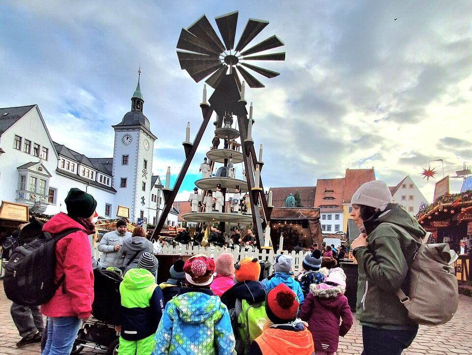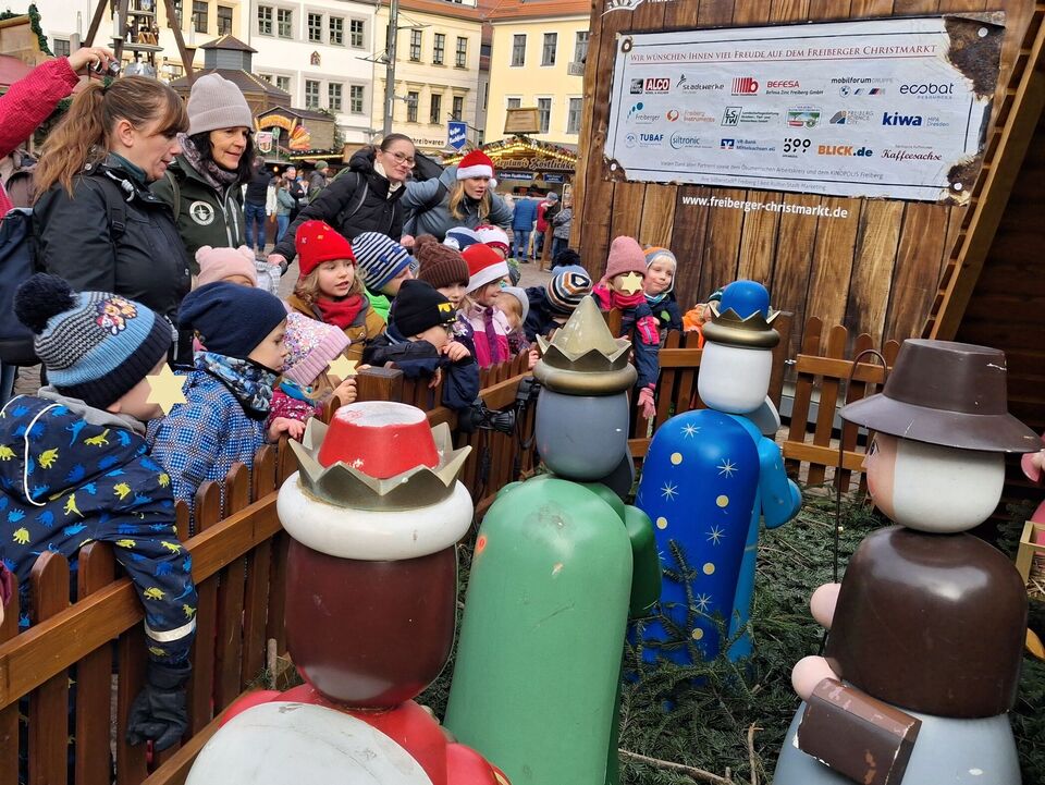Wir schlenderten durch die Stadt, bestaunten bei strahlendem Sonnenschein auf dem Weihnachtsmarkt die große Pyramide und die Krippe mit den lebensgroßen Figuren. Außerdem entdeckten wir an einer Bude ein kleines Bergwerk, dass wir eine Weile beobachteten.