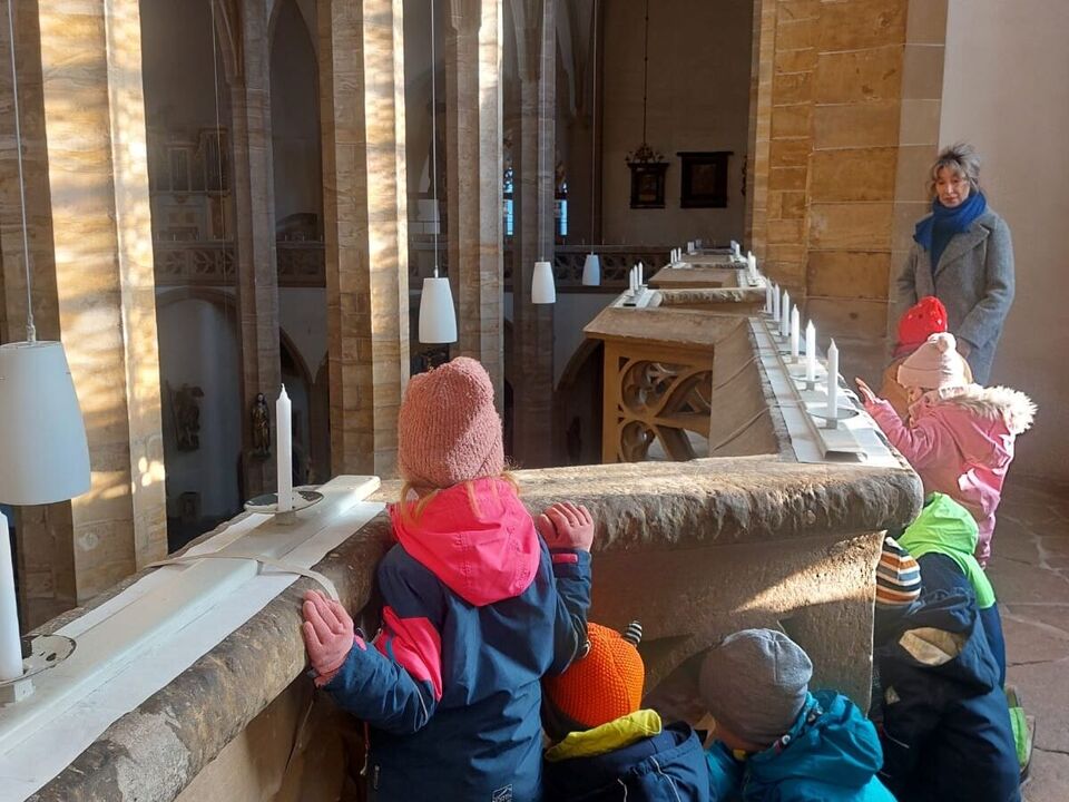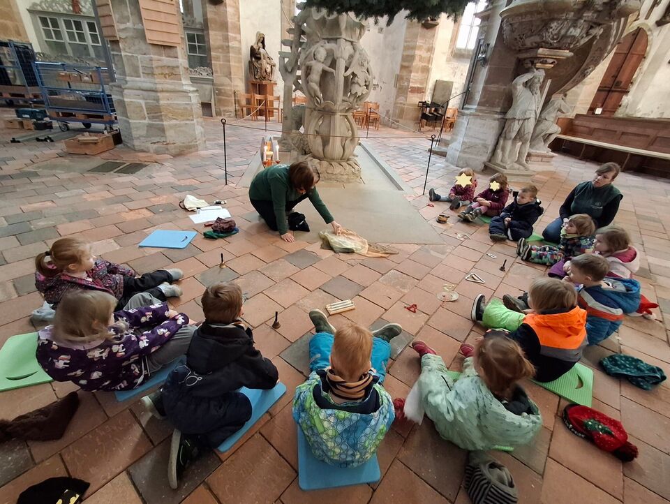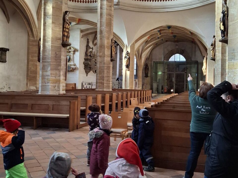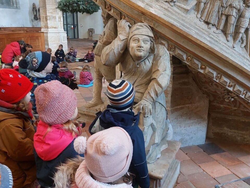 Die jüngeren Kinder erlebten einen Morgenkreis über die Engel, die Boten Gottes. Sie begegneten uns in verschiedenen Szenen der Weihnachtsgeschichte, die wir mit Instrumenten nachspielten. Auch im Dom gab es viele Engel zu entdecken. Gemeinsam bestaunten wir die großen Engel mit Instrumenten an der Orgel und fanden auch viele kleine.
