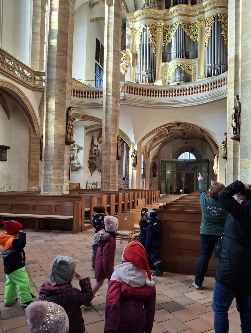 Im Freiberger Dom erwartete die Vorschüler eine Führung. Gemeinsam mit der Führerin erkundeten die Kinder viele Ecken und Winkel, erklommen die Empore und bestaunten die große Orgel, die Figuren und die goldene Pforte.