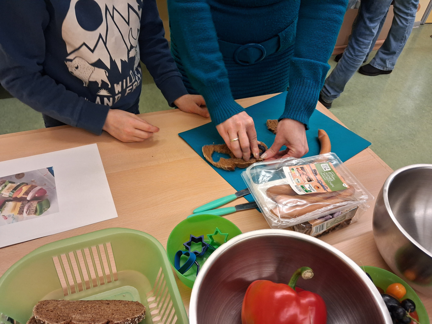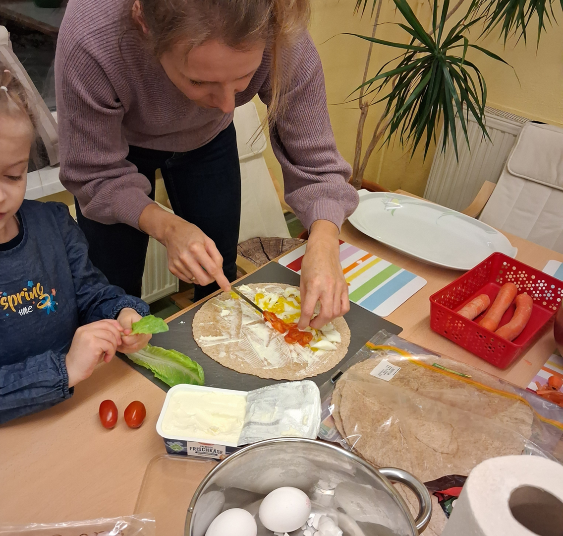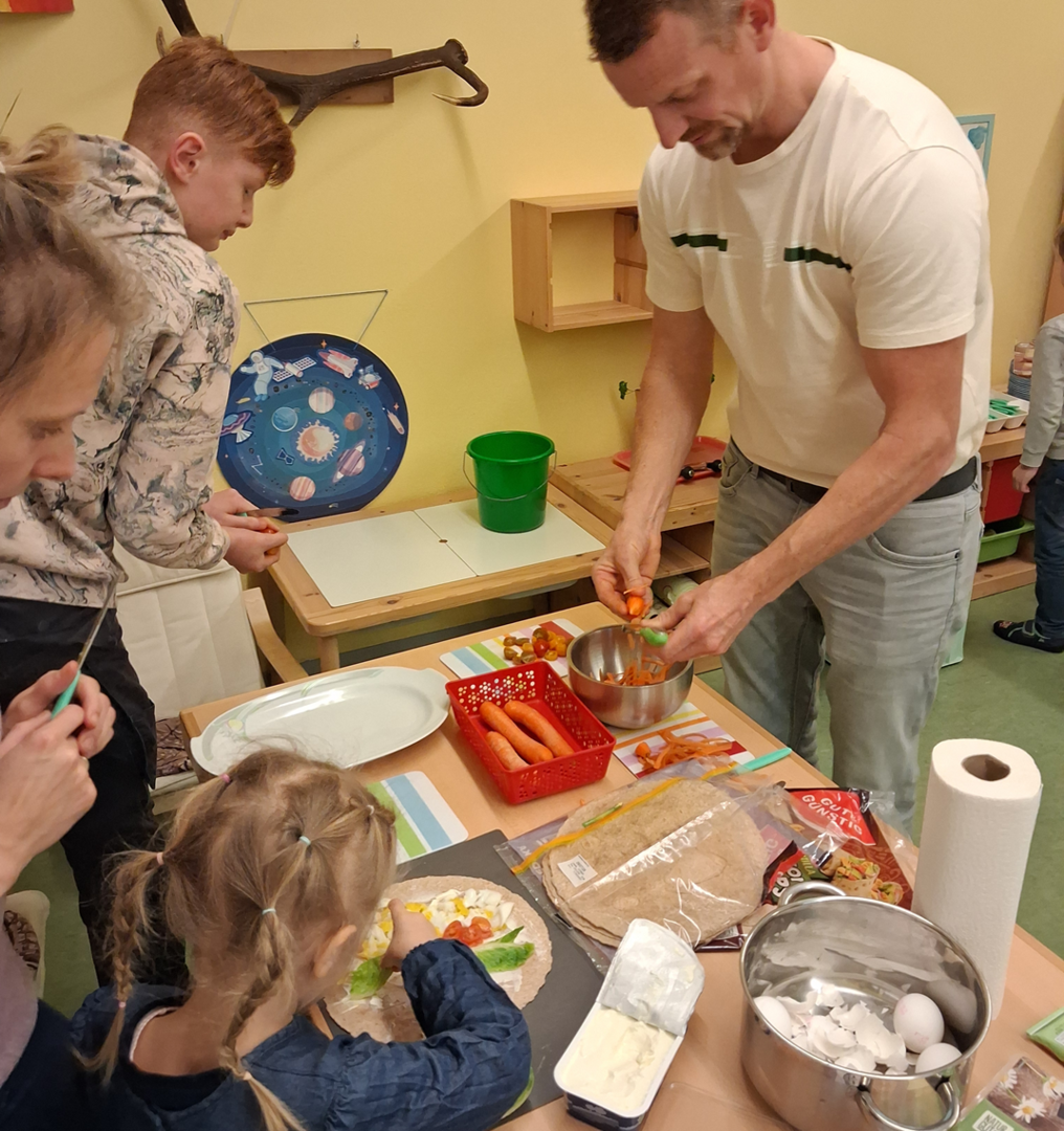 Gemeinsam stellten wir leckere Alternativen für die Brotdose oder Pausenbox her. Es wurde geschnippelt, aufgespießt, geschmiert und gerührt. Dabei entstanden Brotspieße, leckere Kräuterwaffeln mit Quarkdipp, verschiedene Wraps und Tomaten-Mozzarella-Spieße. Natürlich wurde alles verkostet und für lecker befunden!