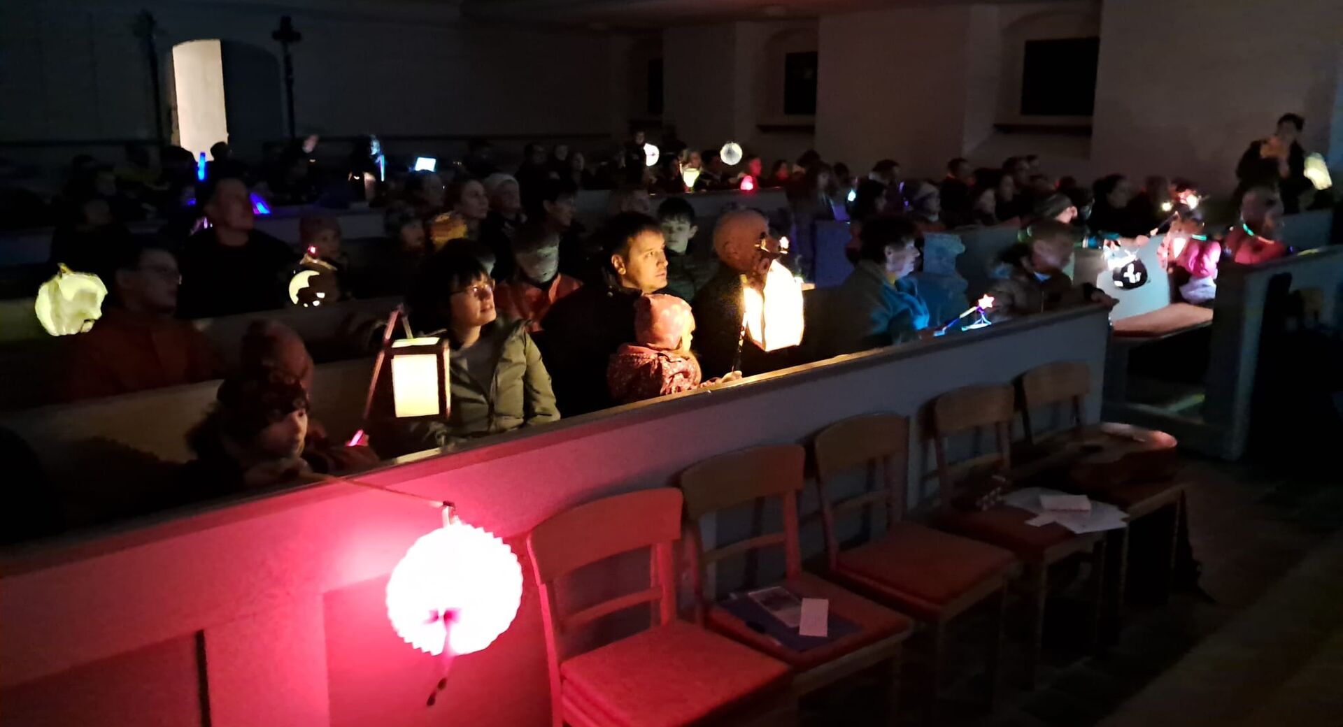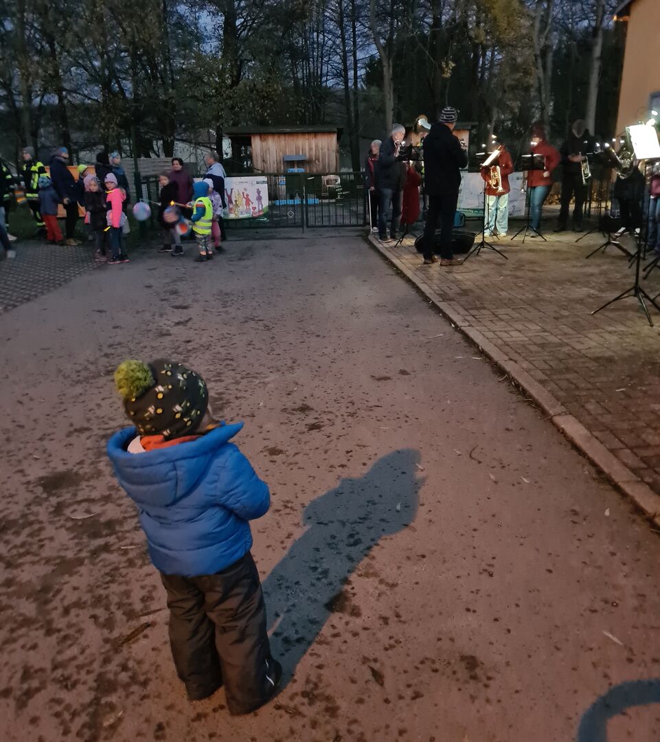 Fehlt da nicht noch etwas? Na klar, der Lampionumzug! Er startete am Kindergarten mit musikalischer Begleitung durch den Posaunenchor. Mit vielen bunten Laternen machten sich die Familien auf den Weg zur Kirche. Sie wurden dabei geleitet von den Lichtern und den Kameraden der Freiwilligen Feuerwehr Zethau.