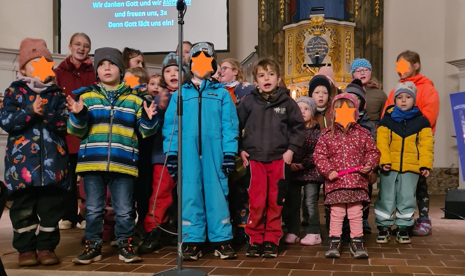 Zum Martinsfest in der Kirche berichteten die Kinder vom Päckchen packen. Die Mitarbeiterinnen bedankten sich für die viele Gaben. Mit Liedern und einem kleinen Theaterstück wurde die Geschichte des Mantelteilens von damals lebendig und auf unseren Alltag übertragen. Alle Gäste waren eingeladen, ihre Sitznachbarn anzuschauen – so könnte ein Mensch aussehen, der Hilfe braucht. Und wie sieht der Martin heute aus? Schaut doch einfach mal in den Spiegel!