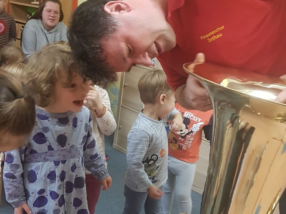 Der Besuch der beiden Posaunenchor-Bläser war für die Kinder des Kinderhauses eine große Überraschung. Mit Begeisterung lauschten sie den Klängen und freuten sich über die verschiedenen Klänge. Sie versuchten auch ihre Lippen in Bewegung zu bringen, was lachend ganz schön schwierig war.