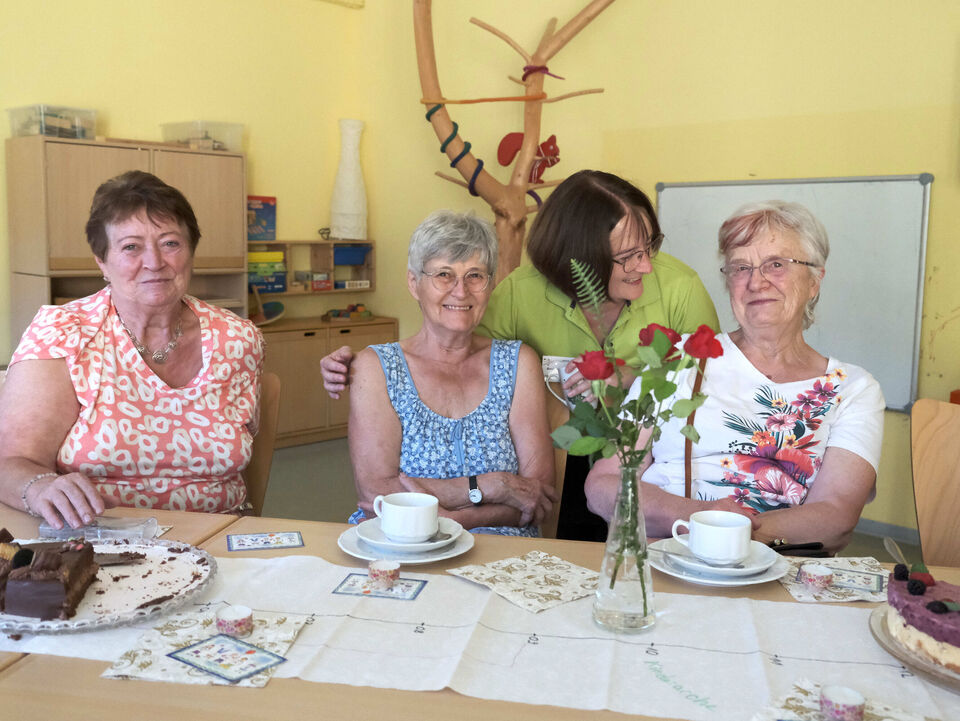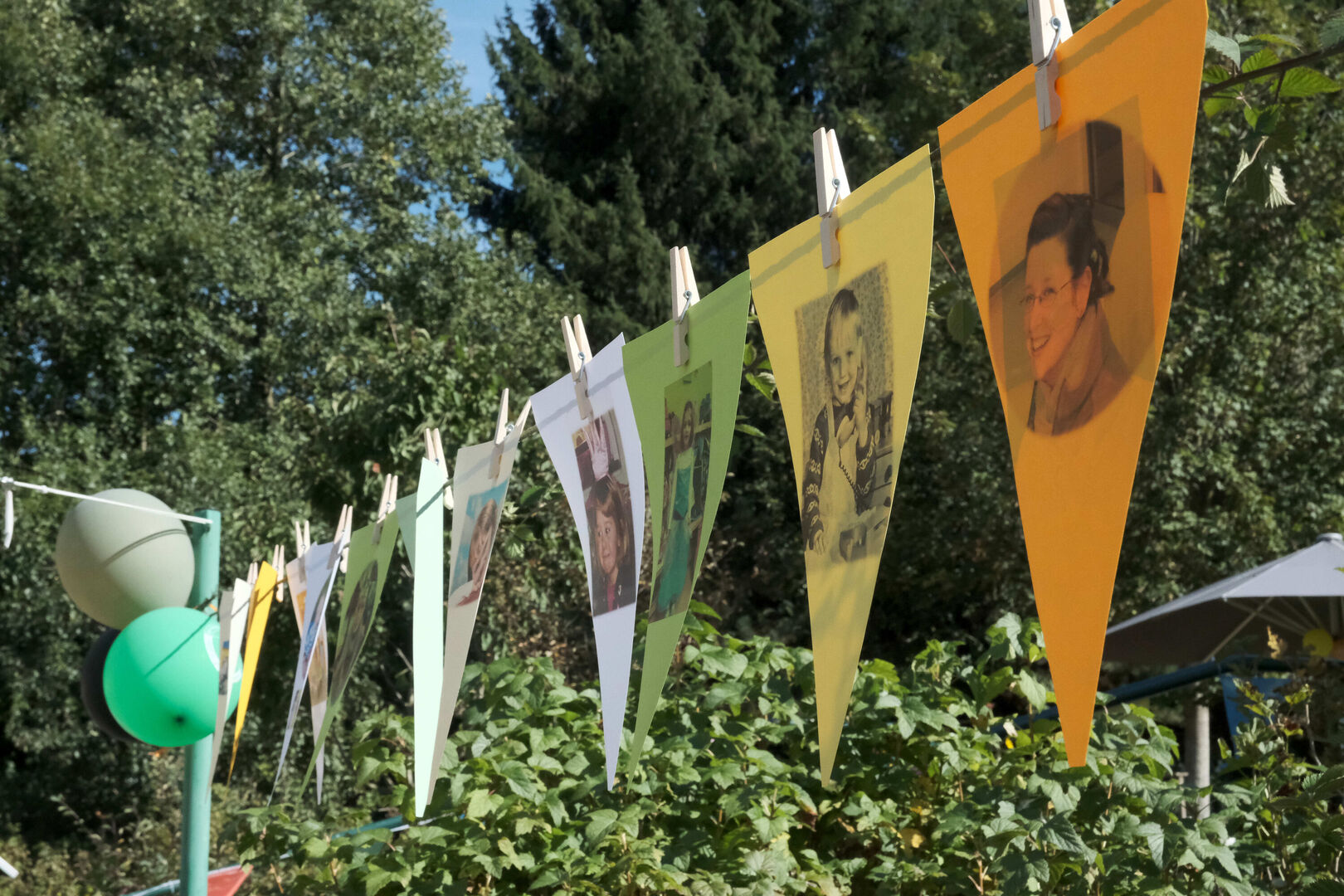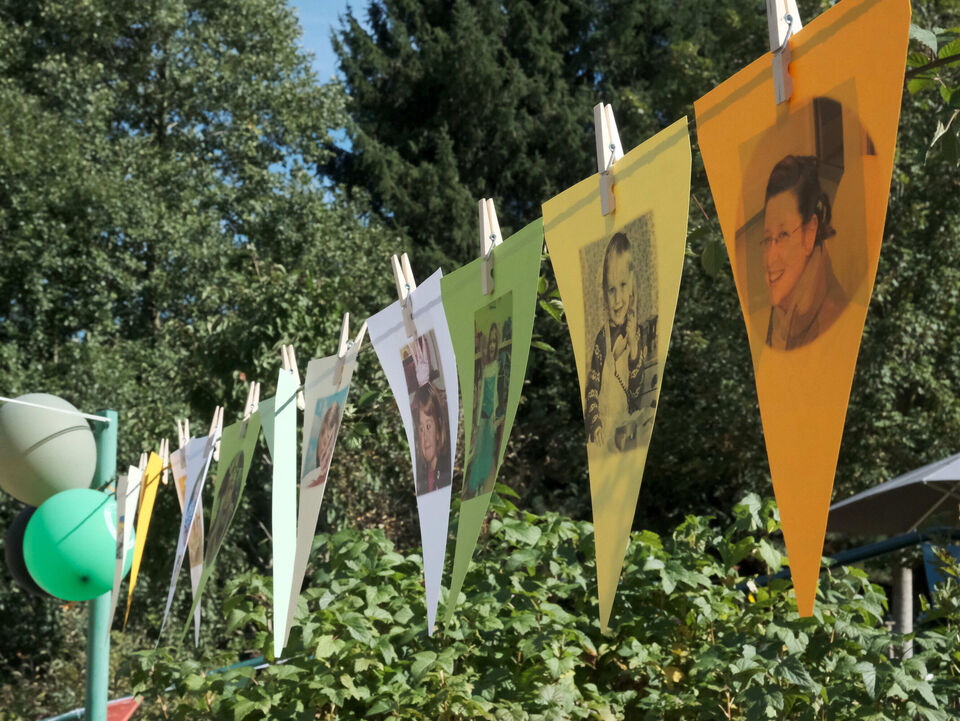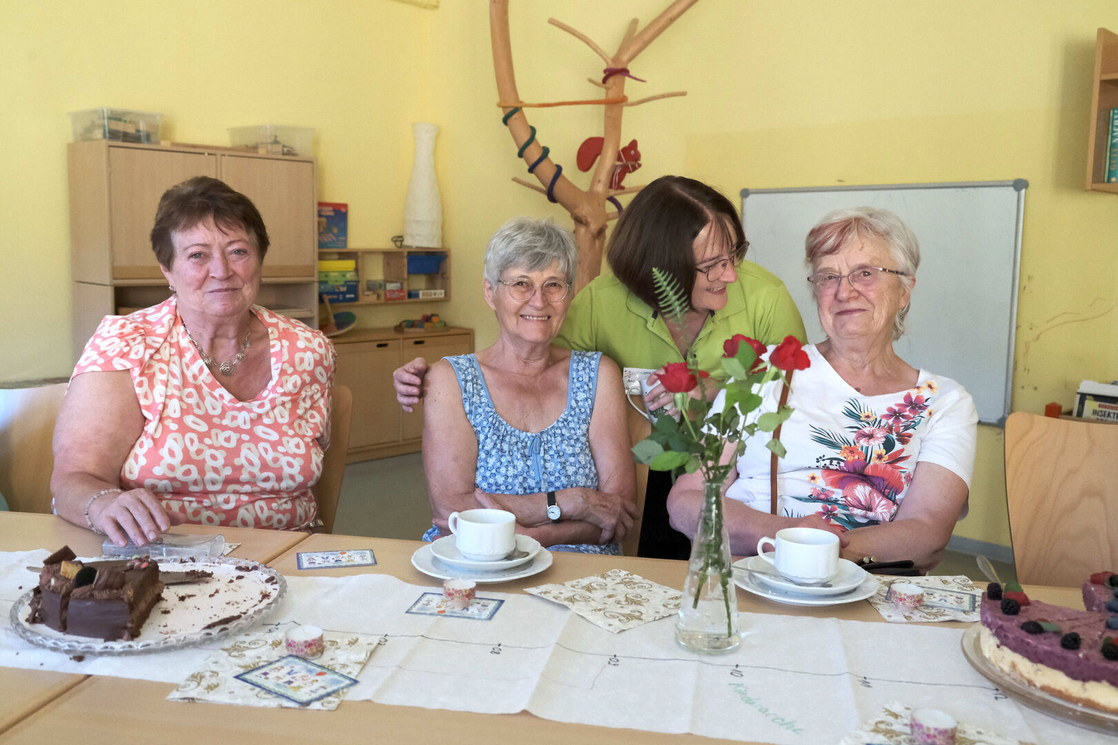 Im Haus gab es ein leckeres Kuchenbuffet, Bilder aus der Geschichte und eine Girlande mit Fotos von ehemaligen Kindern. Die ehemaligen Mitarbeiterinnen konnten sich an einer langen Tafel über ihre Erinnerungen austauschen, auch Bürgermeister Michael Wiezorek nahm daran Platz und lauschte den Geschichten.