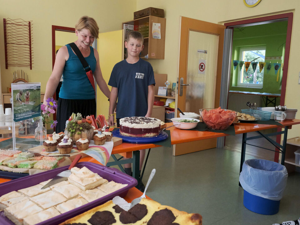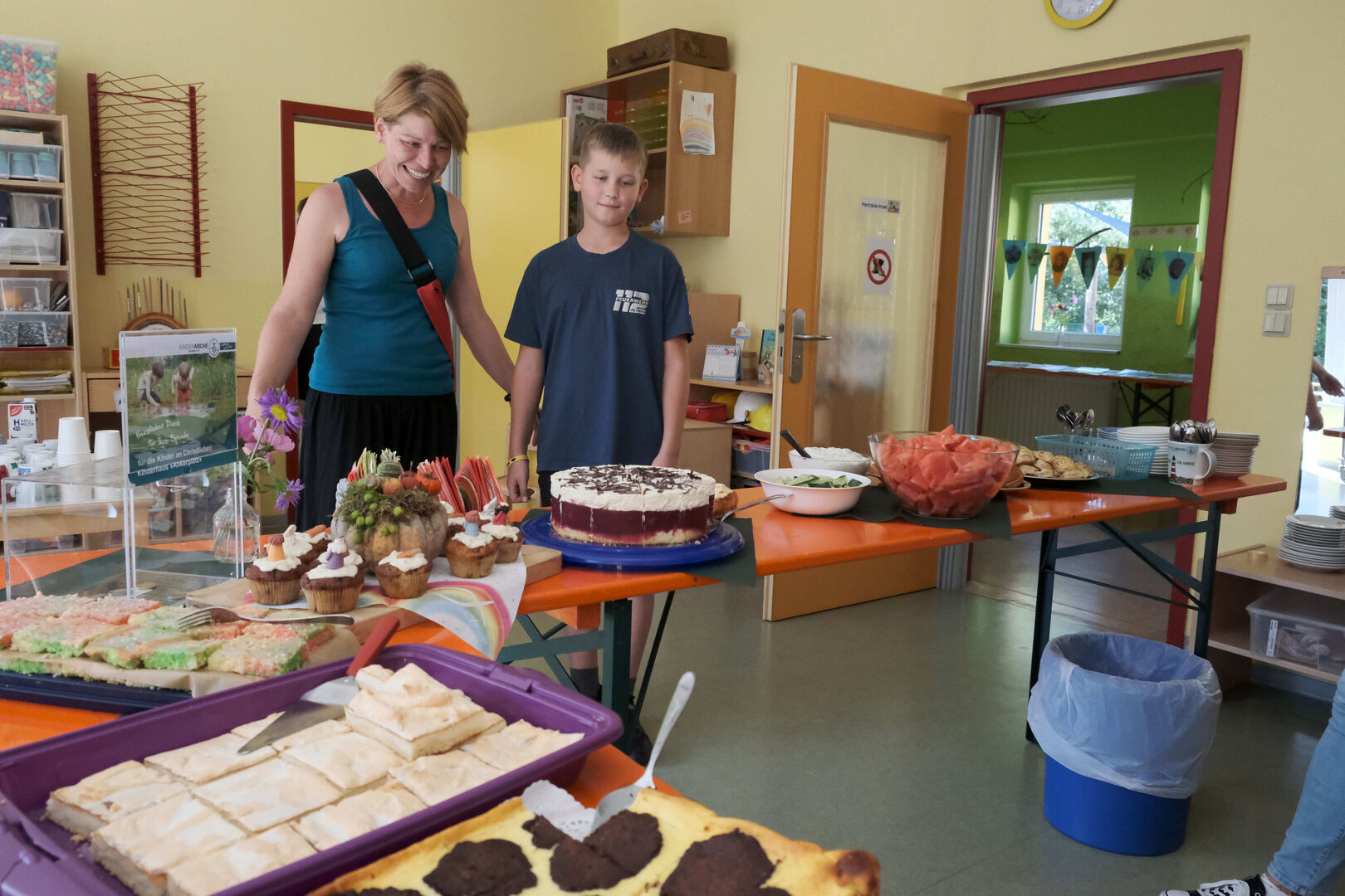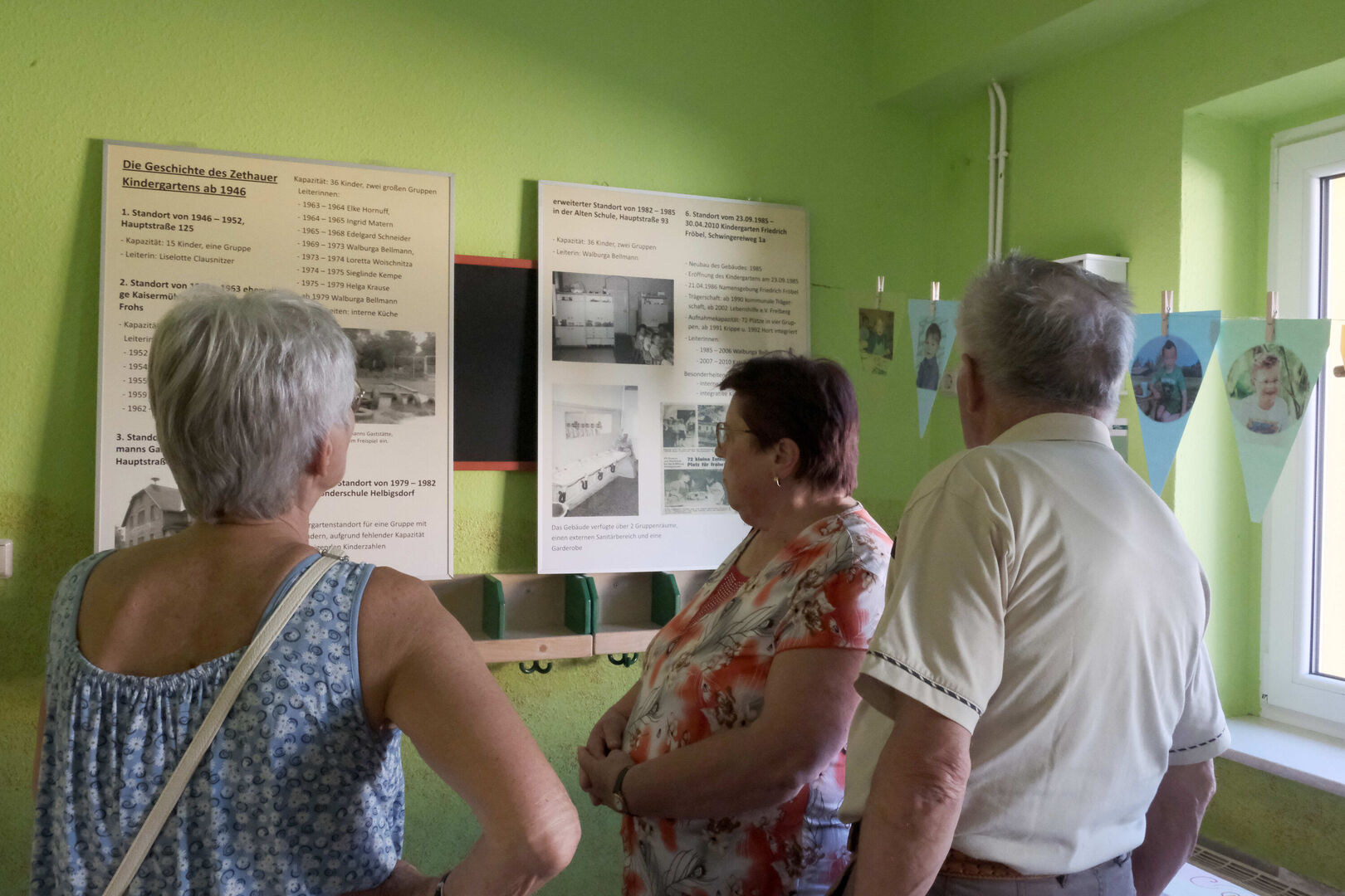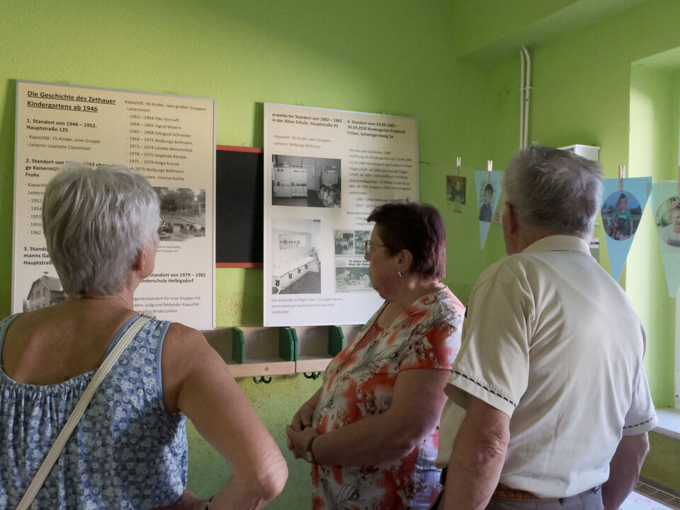 Im Haus gab es ein leckeres Kuchenbuffet, Bilder aus der Geschichte und eine Girlande mit Fotos von ehemaligen Kindern. Die ehemaligen Mitarbeiterinnen konnten sich an einer langen Tafel über ihre Erinnerungen austauschen, auch Bürgermeister Michael Wiezorek nahm daran Platz und lauschte den Geschichten.