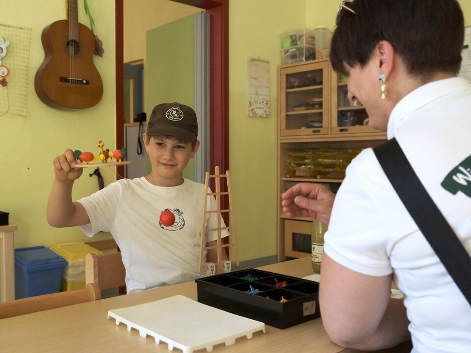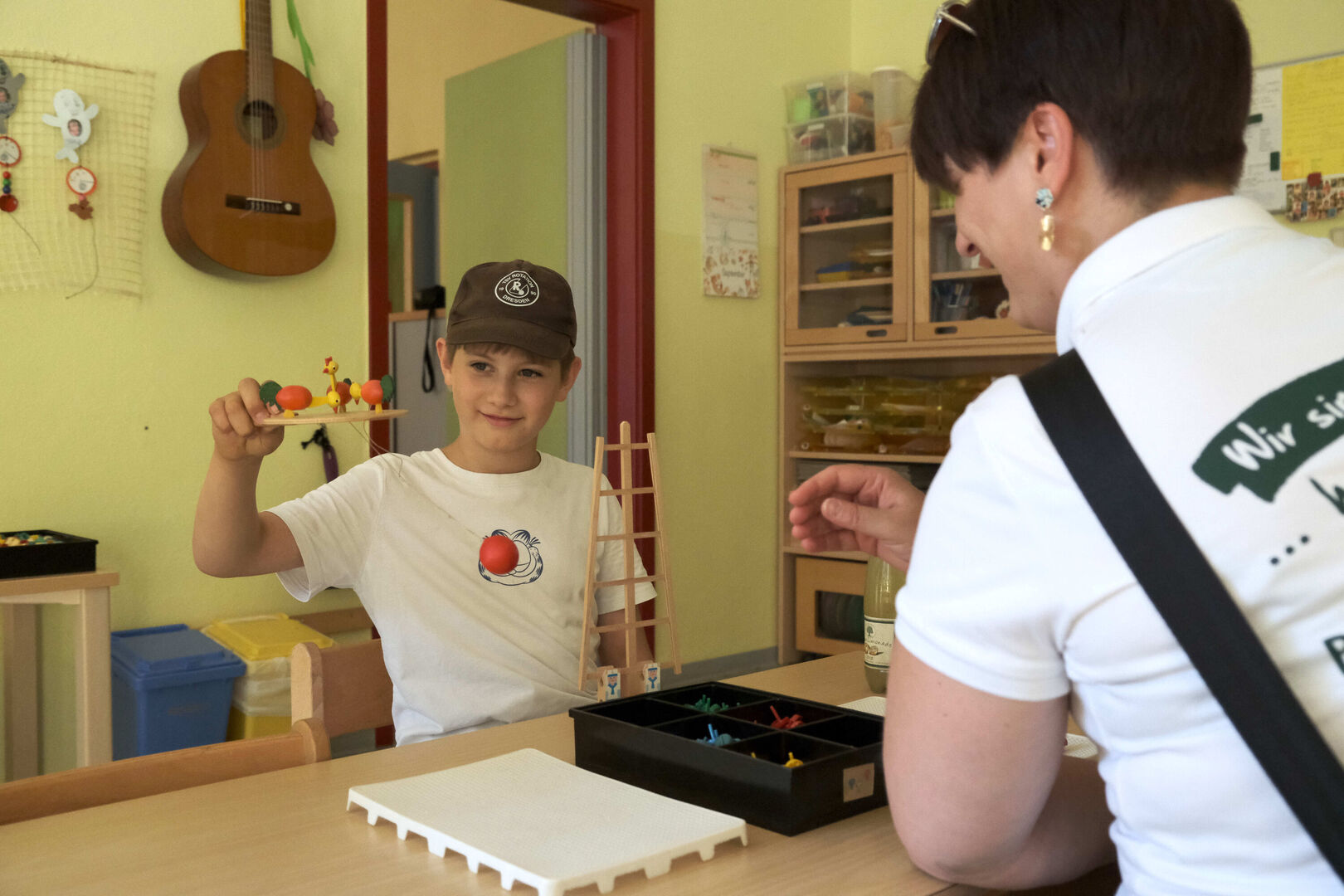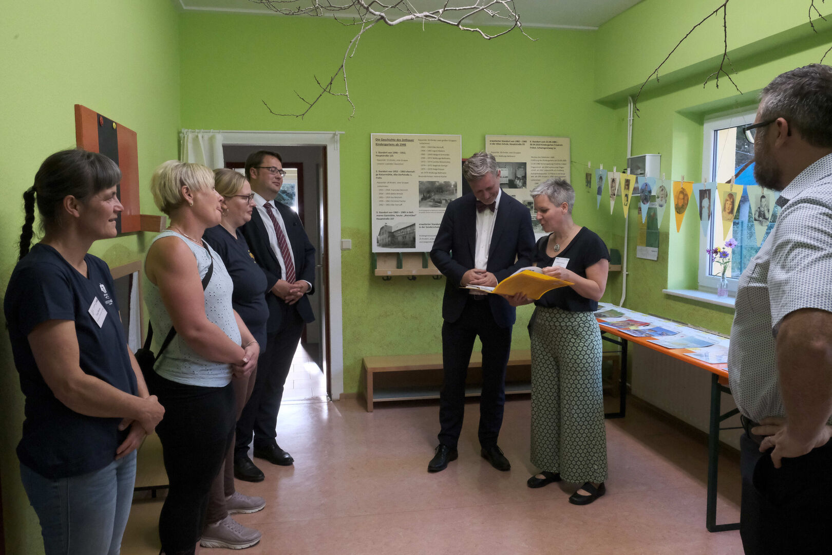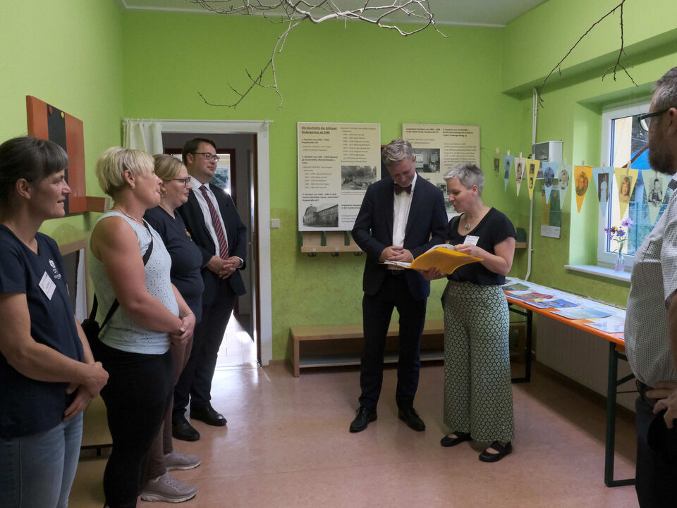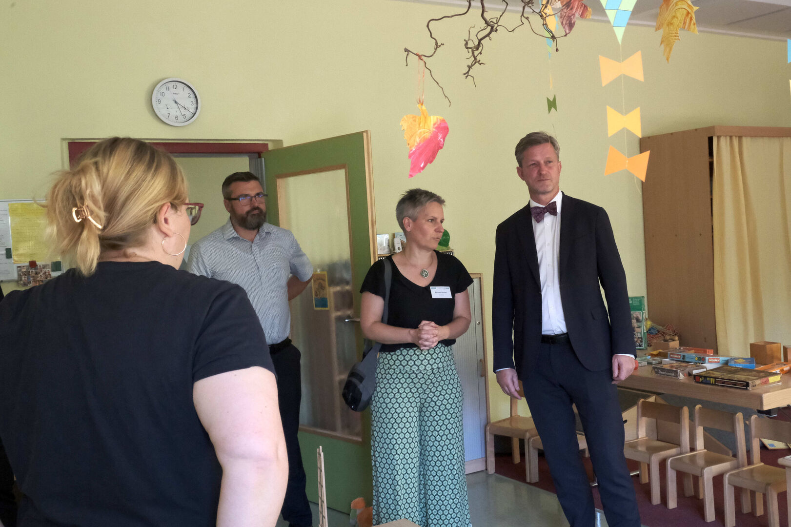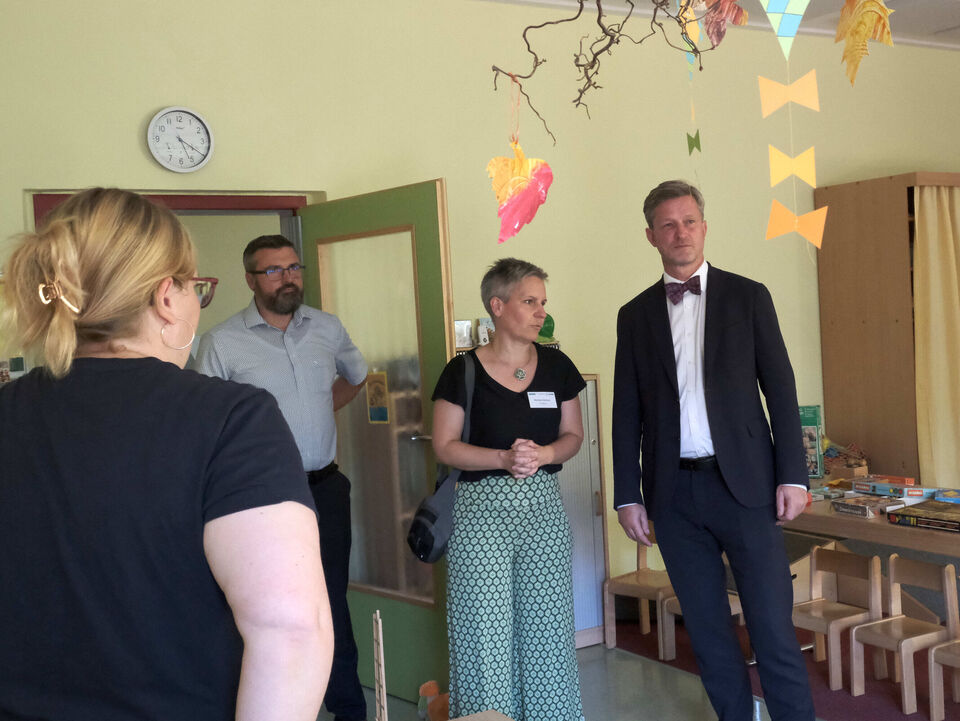 Bei einem Rundgang durchs Haus erklärten Kinderarche-Vorständin Barbara Gärtner, Bürgermeister Michael Wiezorek und Elternvertreterinnen, was es aus ihrer Sicht braucht, damit das Haus auch bei sinkenden Kinderzahlen erhalten werden kann. Andreas Handschuh versprach, diese Ideen mitzunehmen und sich für den Erhalt der Kita stark zu machen.