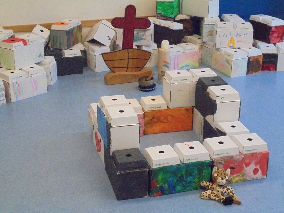 Und aus diesen Bausteinen haben wir bereits am Montag vor dem Treffen einen Turm gebaut. Jedes Kind durfte sich einen Stein aussuchen und einfügen. Danach haben wir überlegt, was wohl passieren würde, wenn wir einige Steine entfernen würden.