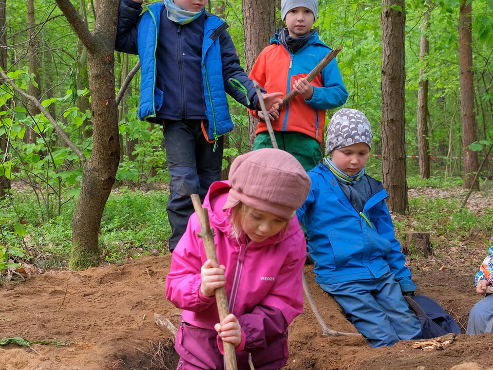 Auf die Frage nach seinem Lieblingsplatz hat jedes Kind eine andere Antwort: die moosweiche Lichtung, auf der man so gemütlich chillen kann, die selbst gegrabenen Löcher, aus denen der Heidesand zu den schönsten Sandkunstwerken taugt, die Zwergenstadt, in der noch schnell die Wege gerichtet werden müssen, das Wald-Xylophon, das noch vom letzten Jahr zwischen den Bäumen hing und nur repariert werden musste, das Haus aus Baumstämmen, in dem man wunderbar Familie oder „Wir fahren in den Urlaub“ oder „Wir zähmen Drachen“ spielen kann.