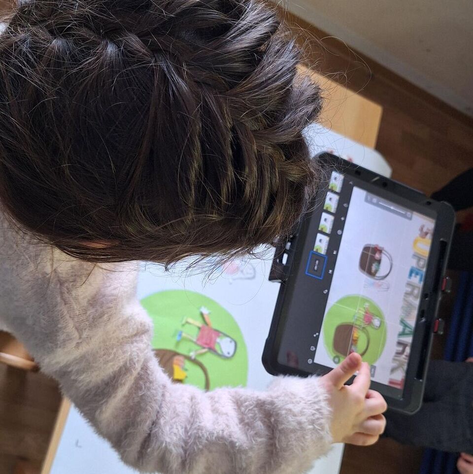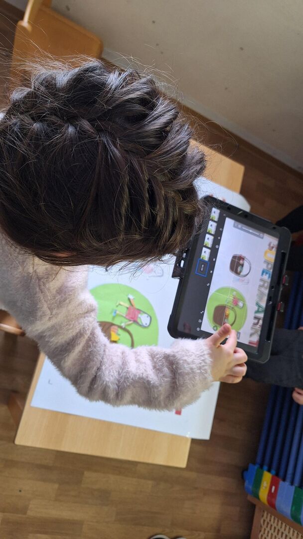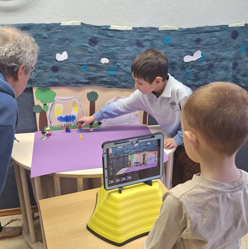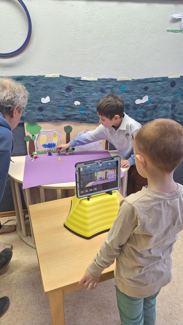 Dann begann in drei Gruppen die „Filmproduktion“: Mit Buntstiften, Schere, verschiedenen bunten Papieren für die Requisiten sowie mit kleinen Leihgaben aus der Spielzeugwelt entstanden Trickfilme zu den unterschiedlichen Themen. Mit Hilfe der Animationstechnik „Stopp Motion“ wurde die Lage der Papiere bzw. Gegenstände auf einem Hintergrund millimeterweise verändert und unzählige Male mit dem Tablet fotografiert. So entstand der Eindruck von sich bewegenden Figuren.