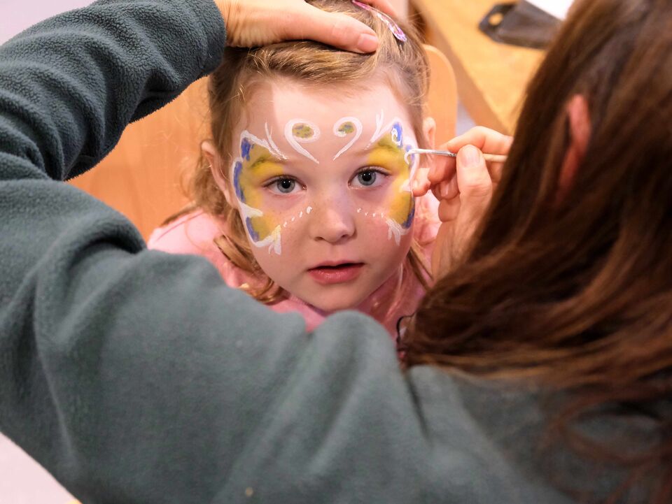 Dann wurden das Kuchenbuffet mit einer beachtlichen Geburtstagstorte und das kunterbunte Treiben im ganzen Haus eröffnet. In allen Bereichen konnten die Kinder mit ihren Eltern Kaffeetrinken, spielen und an zahlreichen Stationen weihnachtliche Basteleien anfertigen: vom Papiertannenbaum über selbst angemalte Baum-Kugeln bis hin zu Tischschmuck aus Naturmaterialien. Im Foyer wartete eine große Tombola und ein Kinderschminktisch auf die Mädchen und Jungen.