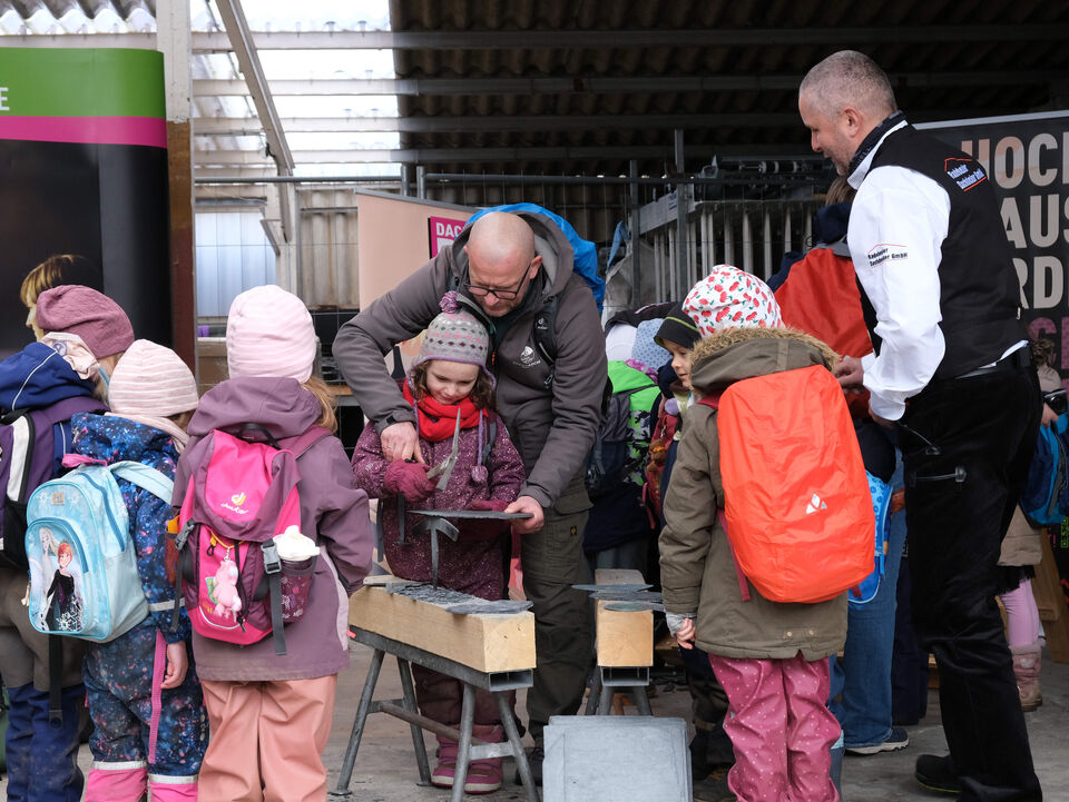 Das hätte er lieber nicht machen sollen, denn natürlich wollte nun jedes Kind ein eigenes Herz mit nach Hause nehmen. Während sein Kollege Rüdiger Mehnert mit den Kindern ins Lehrkabinett ging, hatte der Chef persönlich alle Hände voll zu tun, auf der Haubrücke zwölf Schiefer-Herzen für die kleinen Besucher in Form zu schlagen.