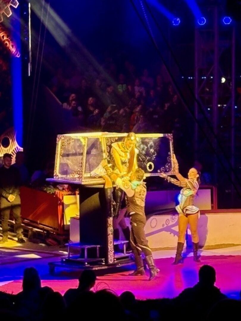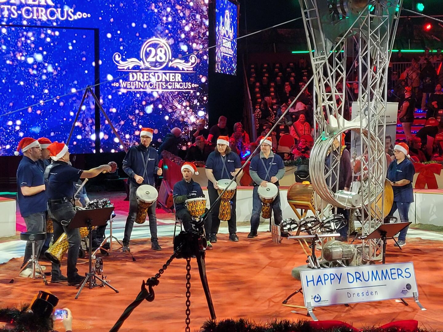 Eine Percussion-Gruppe der Lebenshilfe namens „Happy Drummers“ verkürzte das Warten auf den Start. Atemberaubend waren dann die vielen Artistik-Nummern. Zahlreiche internationale Preisträger zeigten ihr Können am Trapez, bei der Jonglage, auf dem Balancierball oder mit reiner Muskelkraft. Oft hielt dabei das gespannte Publikum den Atem an. Vom dreifachen Salto über 20 Leute an und auf einer Schaukel bis hin zum Magier, der sich seine sechs Assistentinnen einfach aus einer Kiste zauberte, war alles dabei.