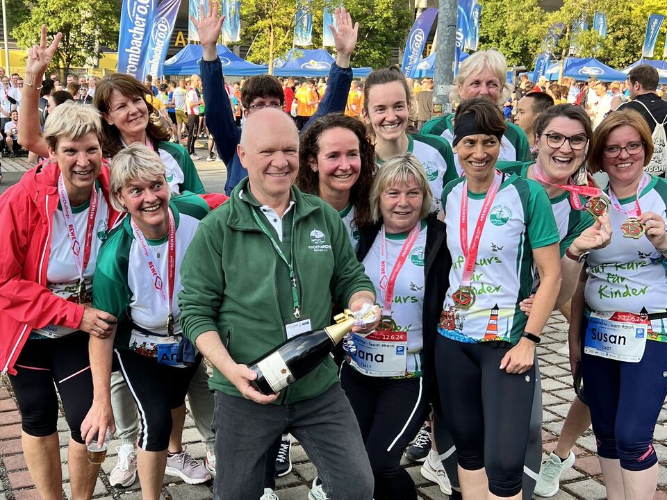 Kinderarche-Vorstand Matthias Lang war zwar nicht unter den Läufern, aber feuerte seine Teams sowohl beim Start als auch beim Zieleinlauf kräftig an und stieß mit den geschafften Läuferinnen und Läufern mit eigens etikettiertem Rewe Team Challenge Sekt zünftig auf den Sieg an. Wir sind dankbar für einen tollen Abend in einer großartigen Gemeinschaft!