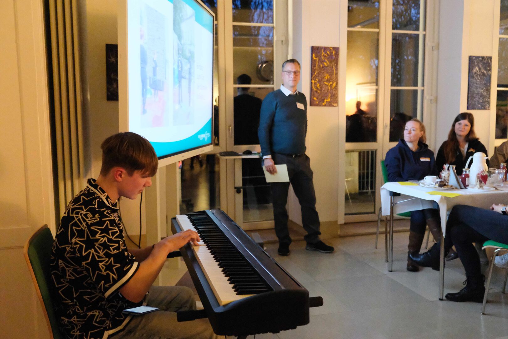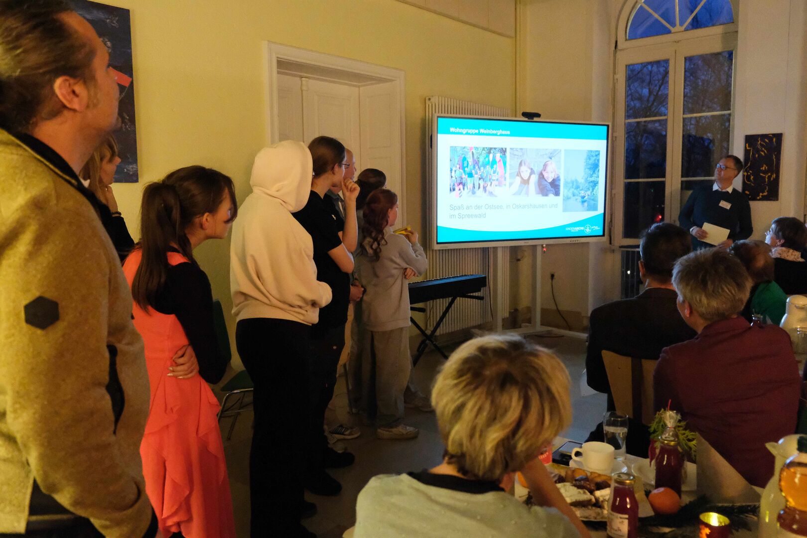 Mit einer Foto-Präsentation nahmen Jugendliche aus jeder Wohngruppe und Christoph Förster für IFB und EFB die Gäste dann mit auf eine kleine Reise durch das vergangene Jahr und dankten für die schönen Erlebnisse, die dank der Unterstützung möglich waren, bis Finn aus unserer Wohngruppe Naundorf mit einem Lied auf dem Klavier den Programm-Teil beendete.