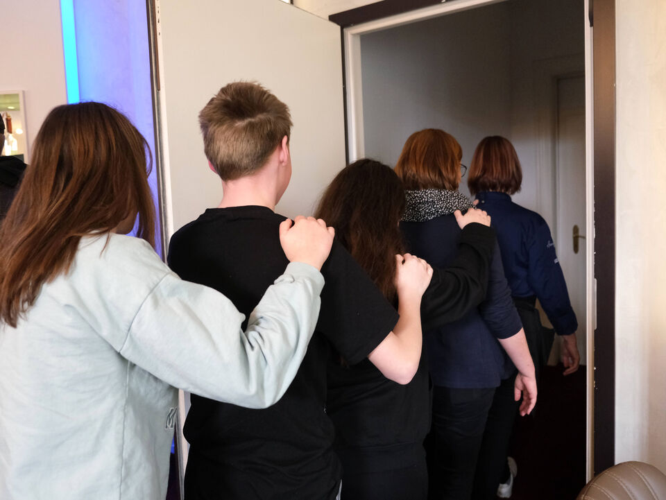 Jeweils in kleinen Gruppen und gut miteinander verbunden folgten die jungen Menschen den blinden Kellern in zwei Räume, in die tatsächlich nicht das kleinste Fünkchen Licht mehr fiel. Für viele war es zunächst eine sehr befremdliche Erfahrung, doch nach und nach gewöhnten sich die Mädchen und Jungen ans Nicht-Sehen und besannen sich auf ihre anderen Sinne. Als schließlich das Essen kam, hieß es: Sehen mit den Händen, schmecken mit der Nase und fühlen mit den Ohren.