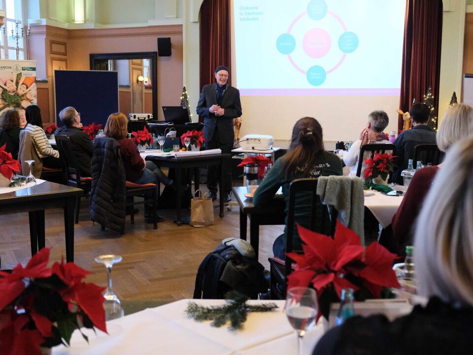 Am Nachmittag begrüßten wir Herrn Oberkirchenrat Dietrich Bauer, Vorstand der Diakonie Sachsen. Er stellte die Diakonie Sachsen als Spitzenverband der Wohlfahrtspflege vor und teilte seine Gedanken zur Einzigartigkeit des diakonischen Profils, das sich im Geist der Barmherzigkeit entfaltet und durch eine besondere Haltung dem Nächsten gegenüber gekennzeichnet ist.