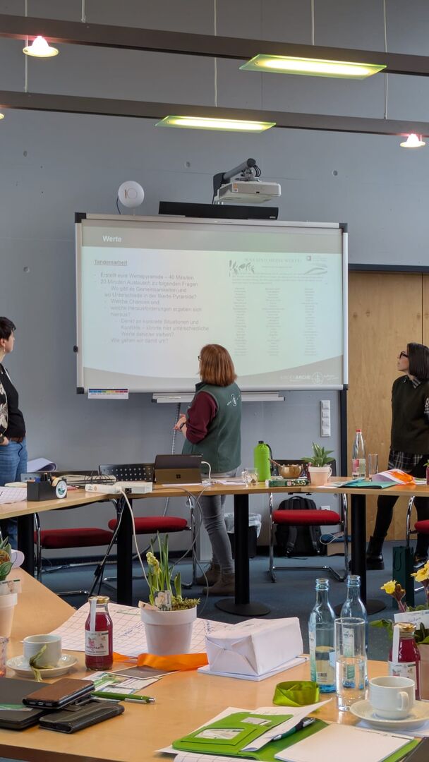 Nach der Mittagspause ging es um verschiedene Wertevorstellungen und den Generationenkonflikt in unseren Einrichtungen. In Einzel- und Teamarbeit erstellten die Stellvertreter:innen jeweils individuelle „Wertepyramiden“ und verglichen sie miteinander. Wo sehen wir Chancen in den Unterschieden, wo Konfliktpotential?
